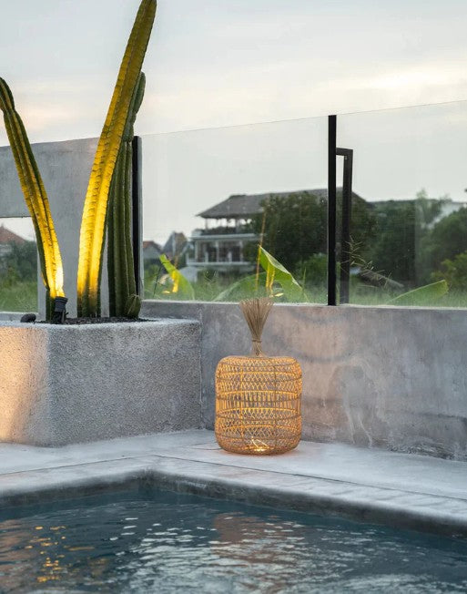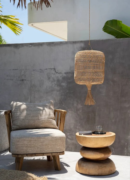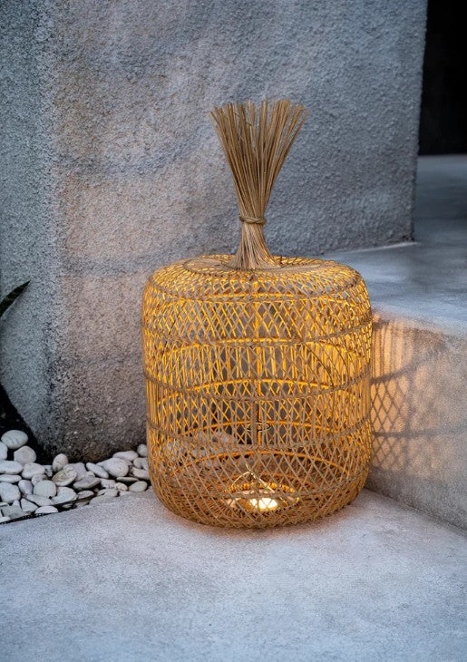 Introducing our versatile roundan lamp, a perfect addition to your home or covered outdoor space that adds a stunning boho look. Depending on your interior, this lamp can be used as a pendant or floor lamp, creating a beautiful and cozy ambient light. Get inspired by these unique lamps, a decorative standout! Please note that lamp fitting and cable are not included. Need a different color? You can easily spray the rattan in black or any color you desire. Color: Natural | Materials: Rattan | Height (cm): 65 | Width (cm): 29 | Length (cm): 29 | Includes wiring? No.