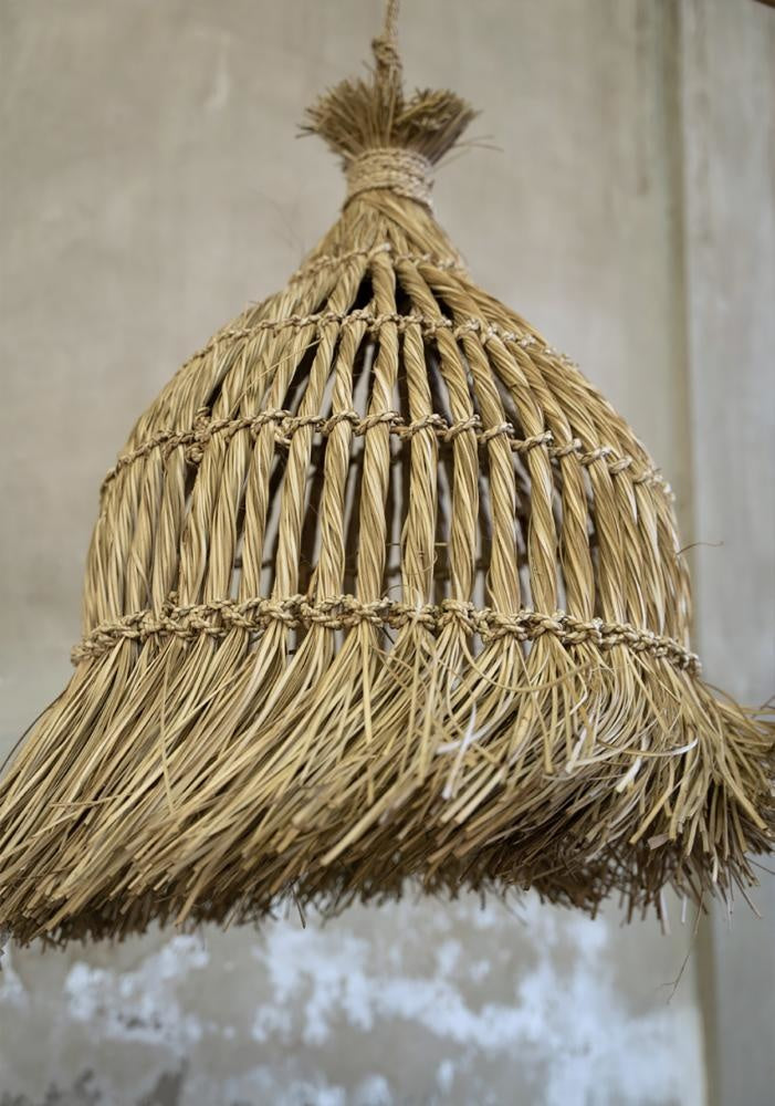 Bring the island vibes into your home with this beautiful Guagua pendant lamp, available in two sizes. Handcrafted from mendong grass and water hyacinth, it exudes a natural charm. Hang it in your living room, bathroom, or covered outdoor space to create a cozy atmosphere with stunning light patterns. This lamp comes with its own hanging cord.