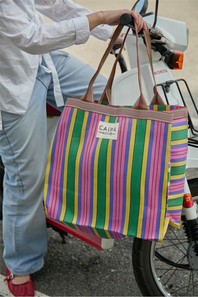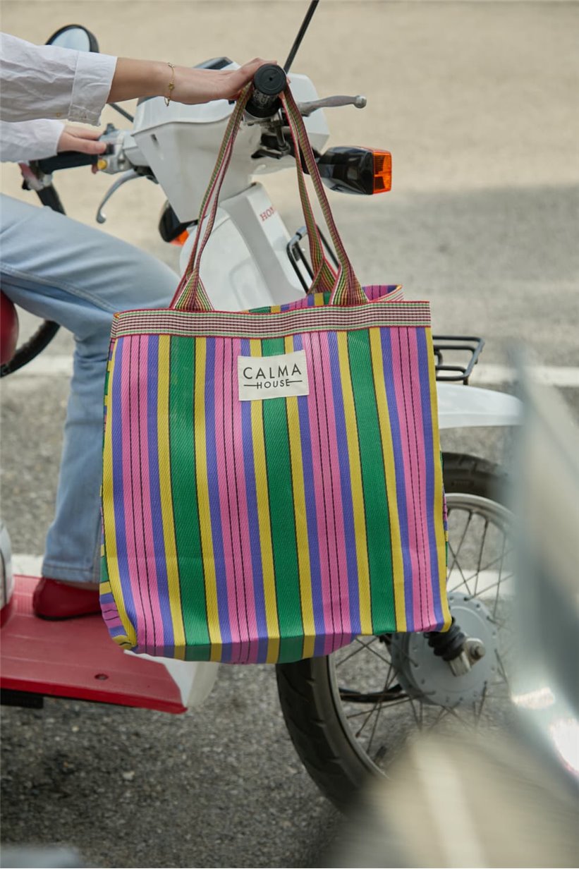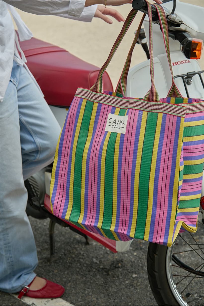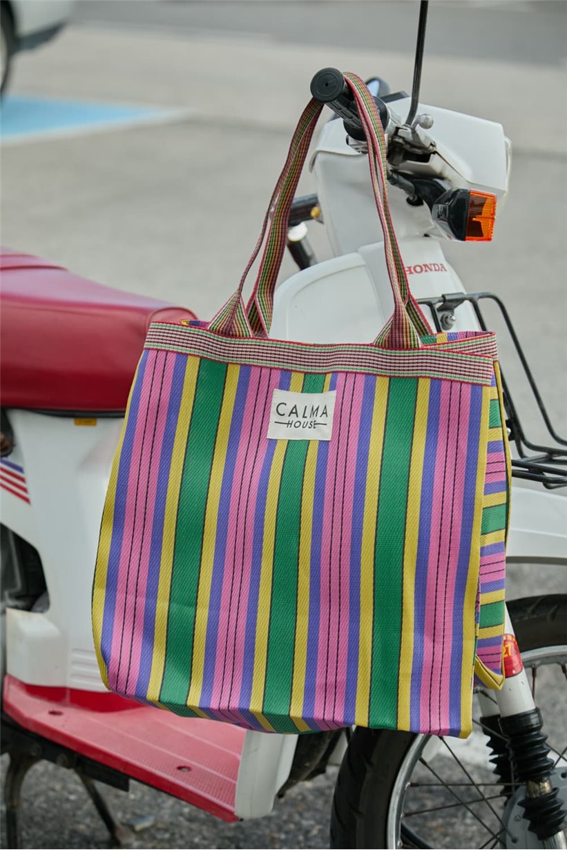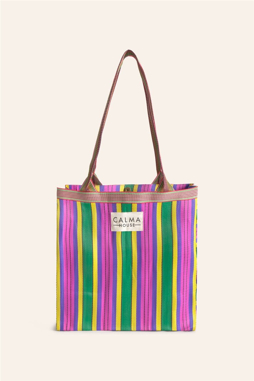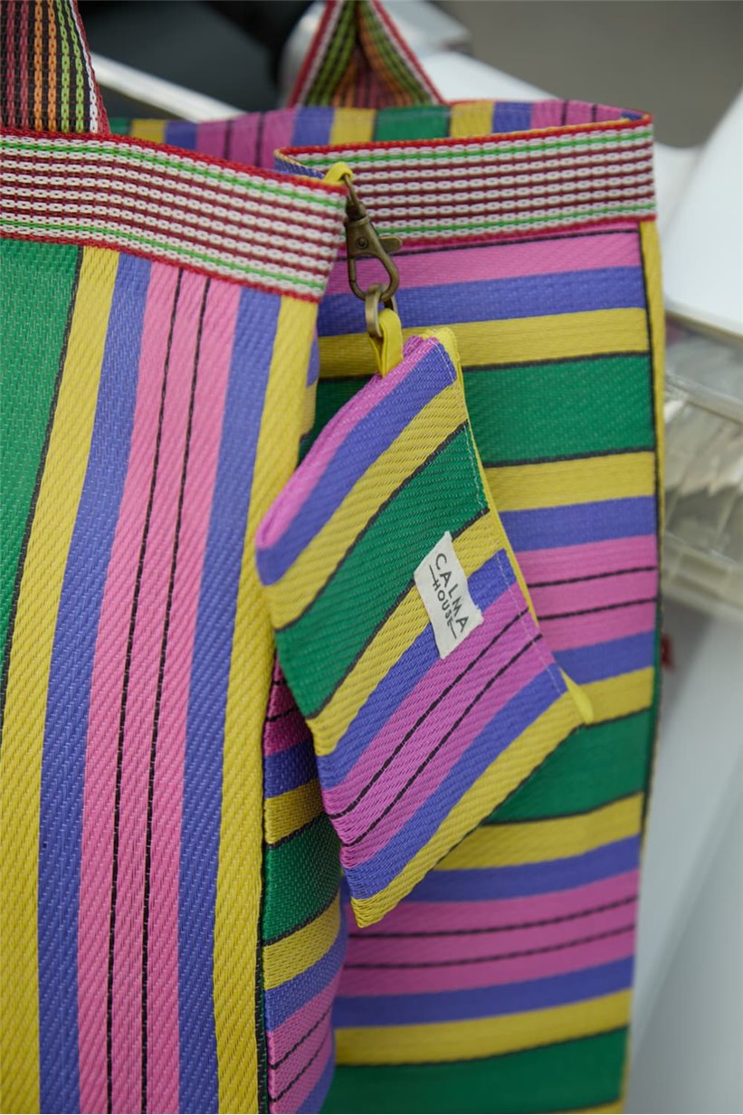Recycled PET bag with a white and blue striped design. Carry handle. Magnetic snap closure. Interior key strap; includes a Table matching coin purse.