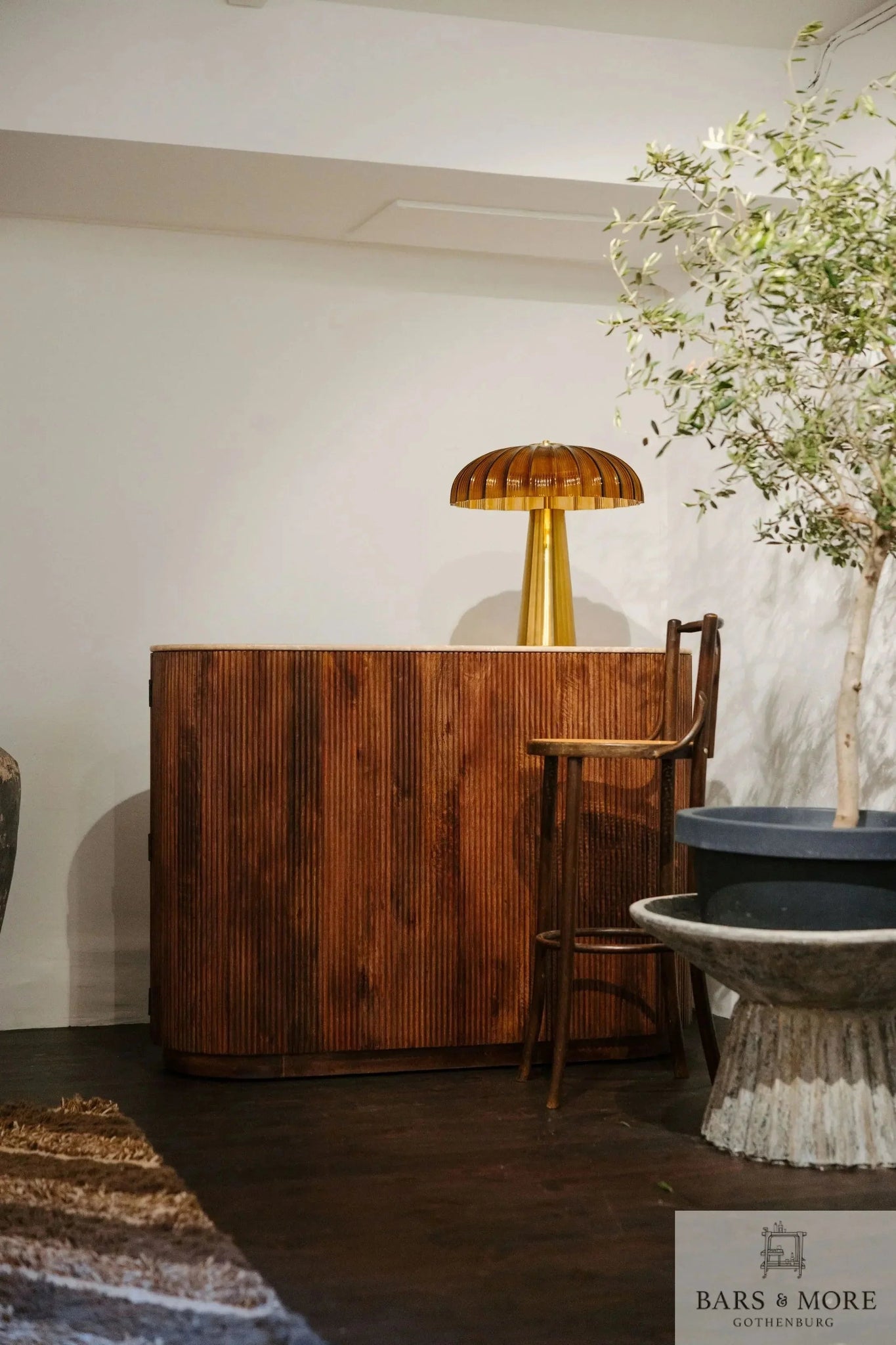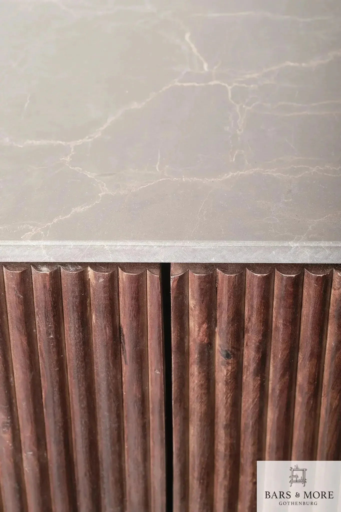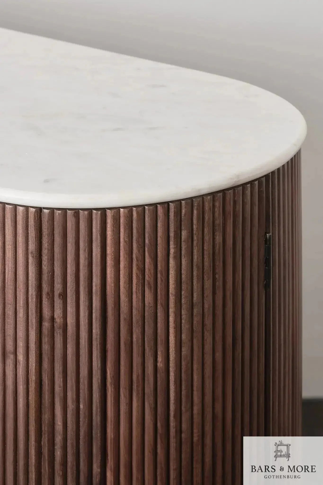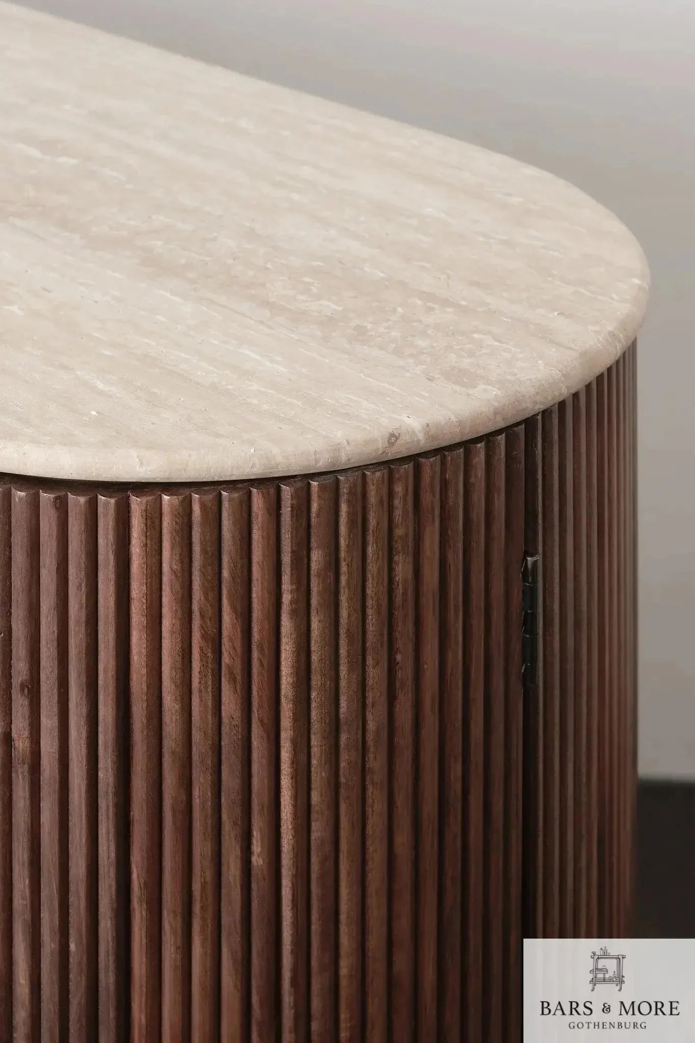 Memphis Bar Cabinet: handcrafted solid acacia with a marble top (travertine beige or classic white). Generous, elegant storage: 21 handmade wine compartments, 7 glass hangers, two closable rounded side doors with 30 cm interior shelves, and a central display shelf (53 cm). Dimensions: H103 × W140 × D52 cm; weight 80 kg. Combining bold proportions and refined detailing, the Memphis is a timeless centerpiece. Crafted by Bars & more (Gothenburg), it delivers durable, premium design for sophisticated entertaining.
