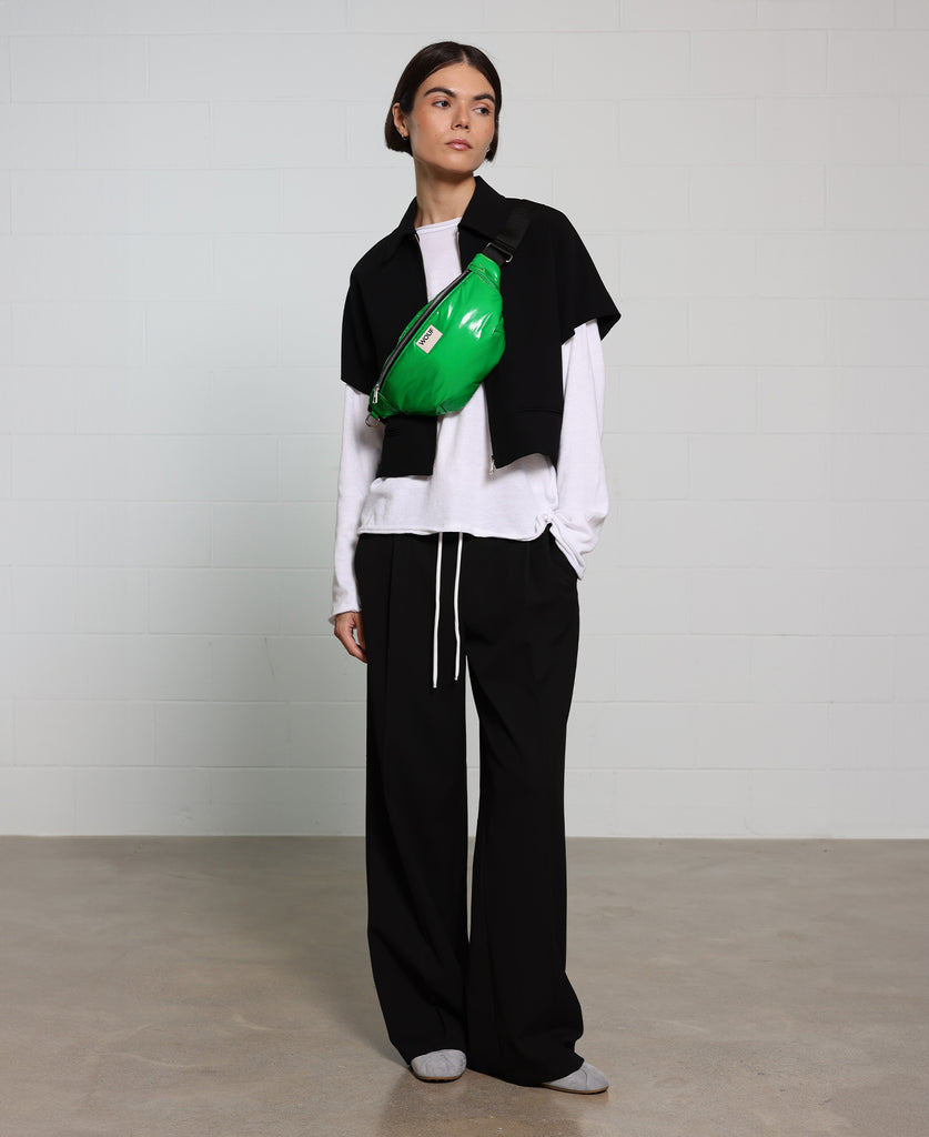 The Basil waistbag, made from 100% recycled fabrics, offers hands-free practicality with a shiny finish. It features a water-repellent surface, an adjustable strap, a main zipped compartment, and an inner pocket to keep your essentials organised.
