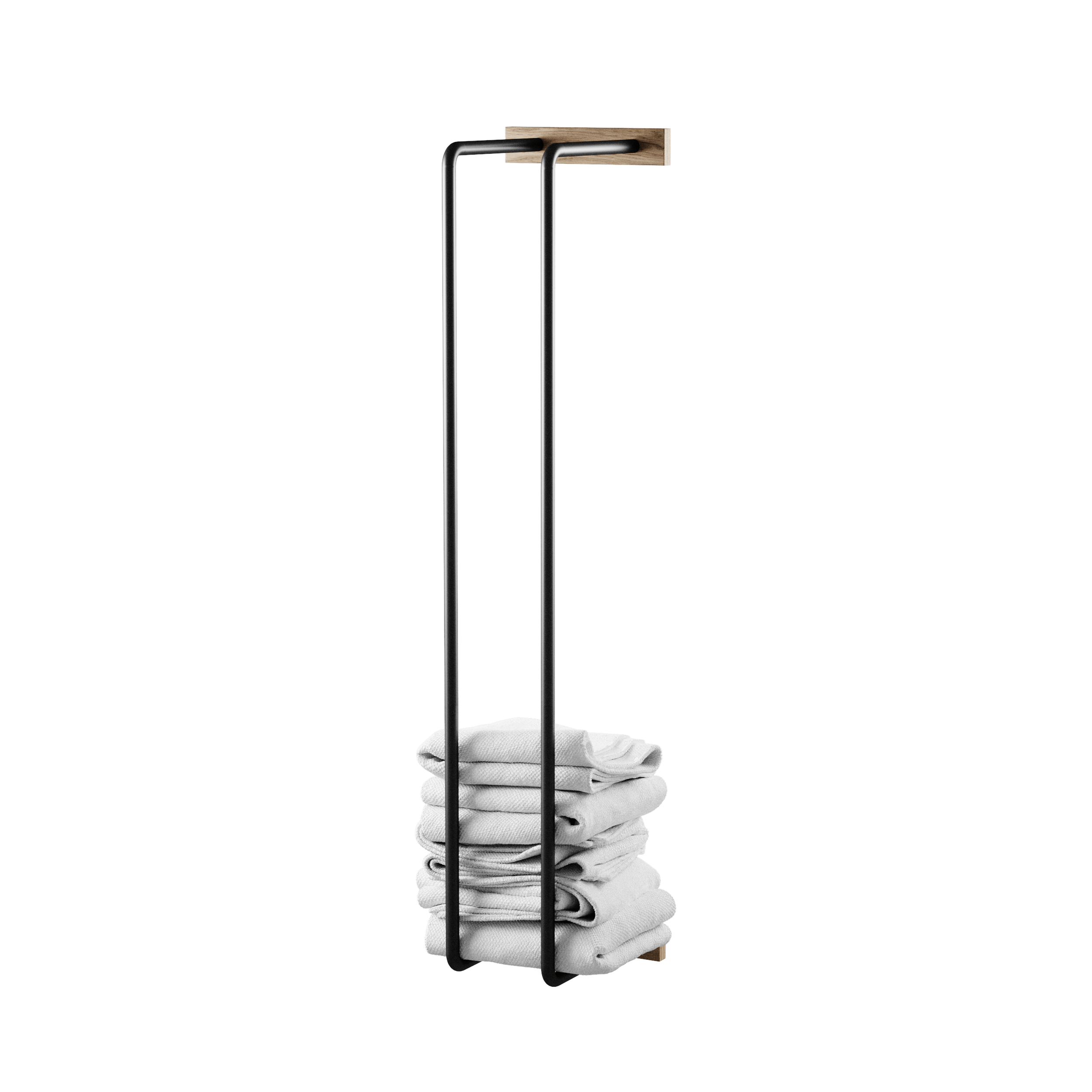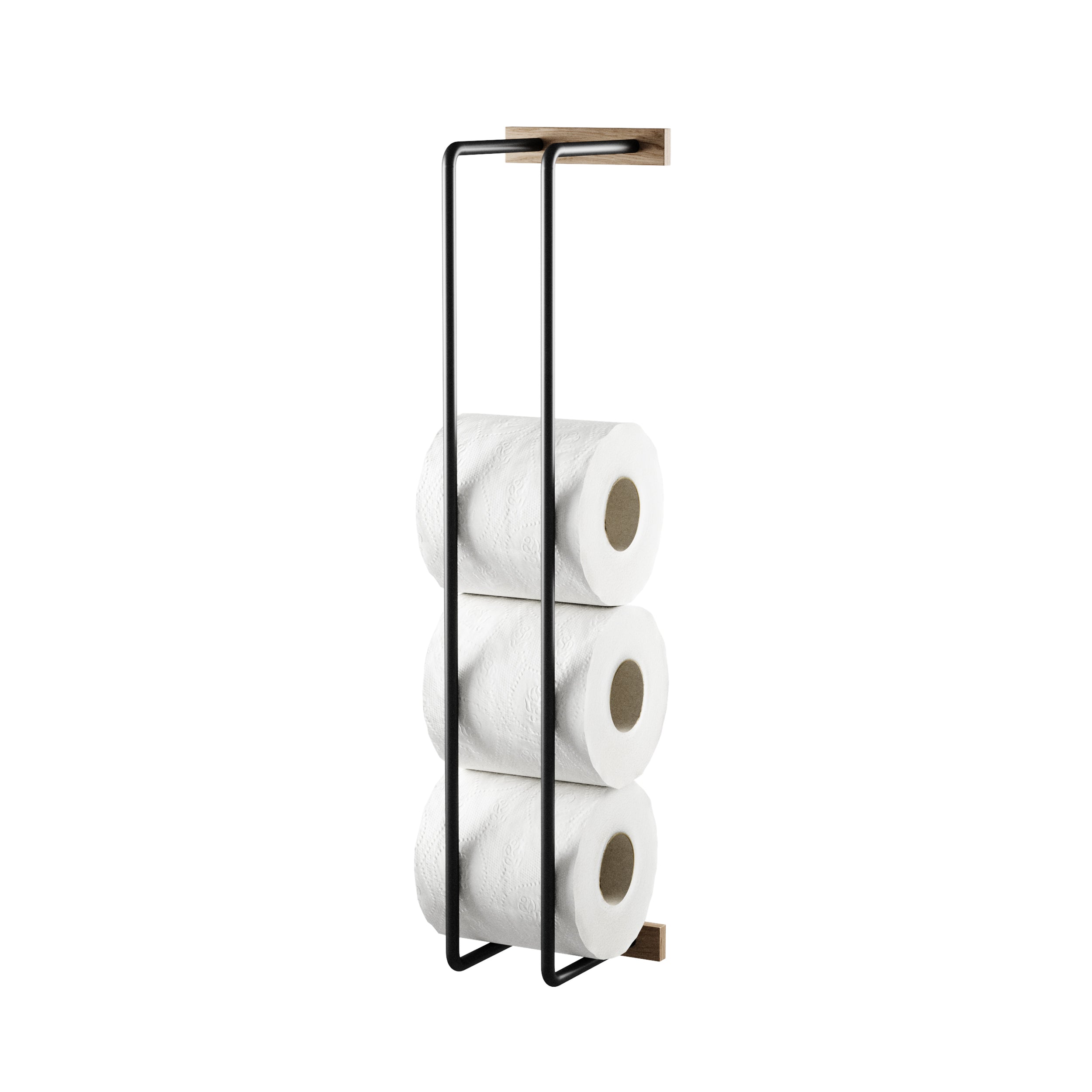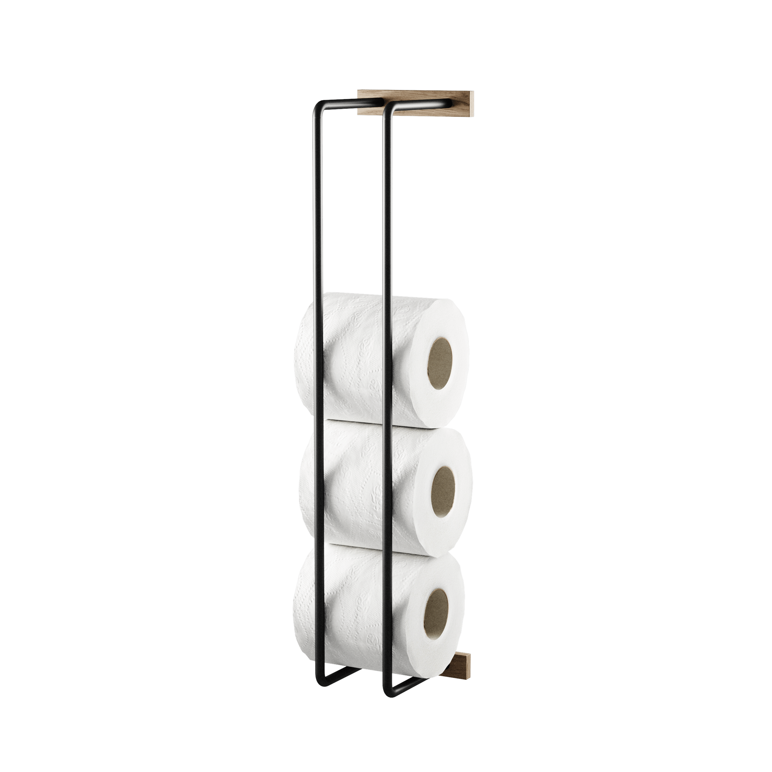 The Bathroom Rack is a smaller version of our Towel Rack and serves as a practical and stylish storage for toilet paper. The warm oak panels made from sustainable oak make the black metal frame appear soft and give your bathroom a subtle spa look.