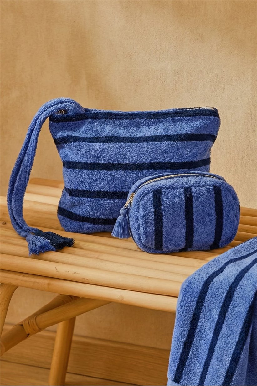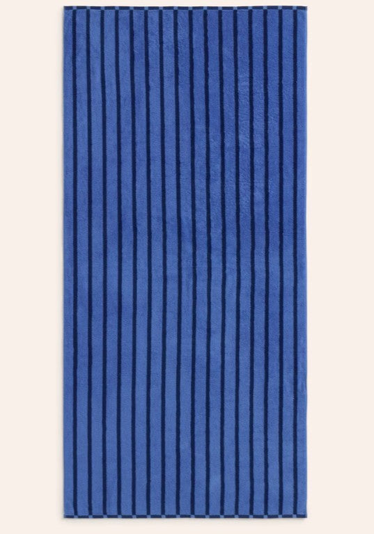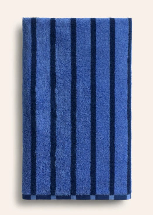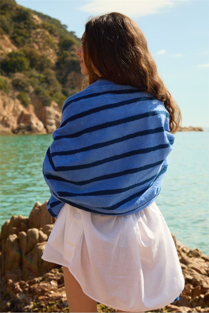 Blue striped terry cotton bath towel. High GSM and high absorbency.