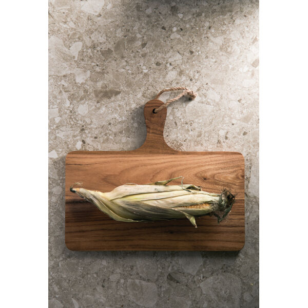 Stylish cutting/serving board that will brighten up any kitchen. The cutting board is made of FSC®-certified teak and has a beautiful golden to medium brown wood shade which darkens over time. The board has a high oil content which makes it very resistant to rot. Equipped with a sturdy handle that allows it to be easily moved from kitchen to table.