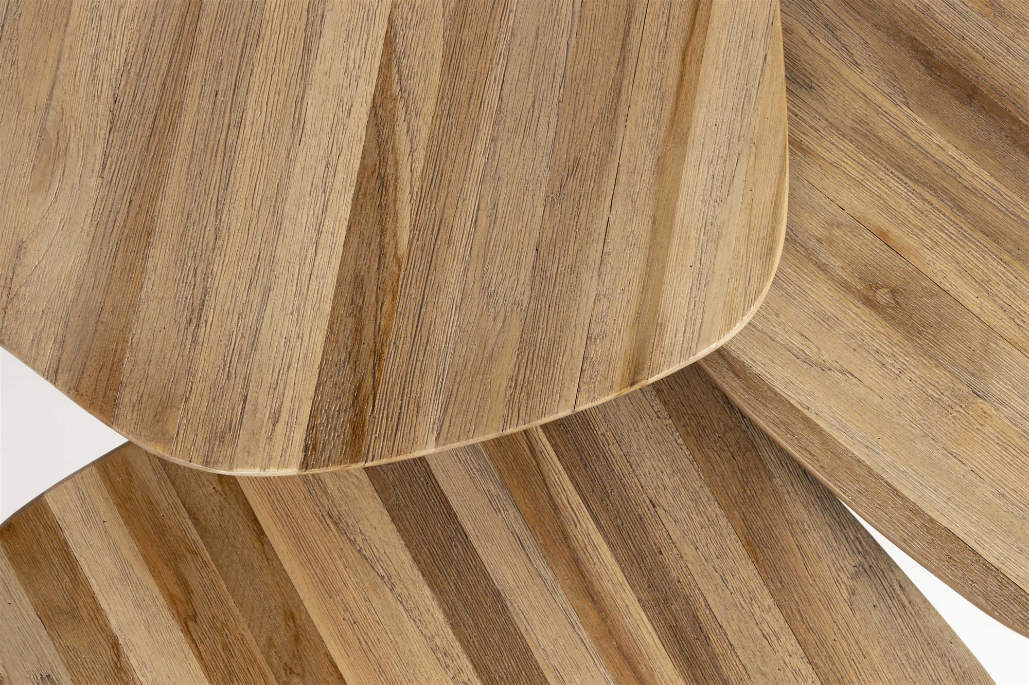 This stylish set of three tables brings a minimalist and Scandinavian look to your interior. Thanks to the durable wood material and warm brown color, these tables form a timeless basis that is easy to combine with various interior styles. The tables are sturdy, durable, and versatile, allowing them to serve as a coffee table, side table, or decorative element. The thoughtful design fits perfectly with the latest interior trends and makes this set a favorite for those looking for functionality and elegance in their home. An ideal choice for a contemporary interior.