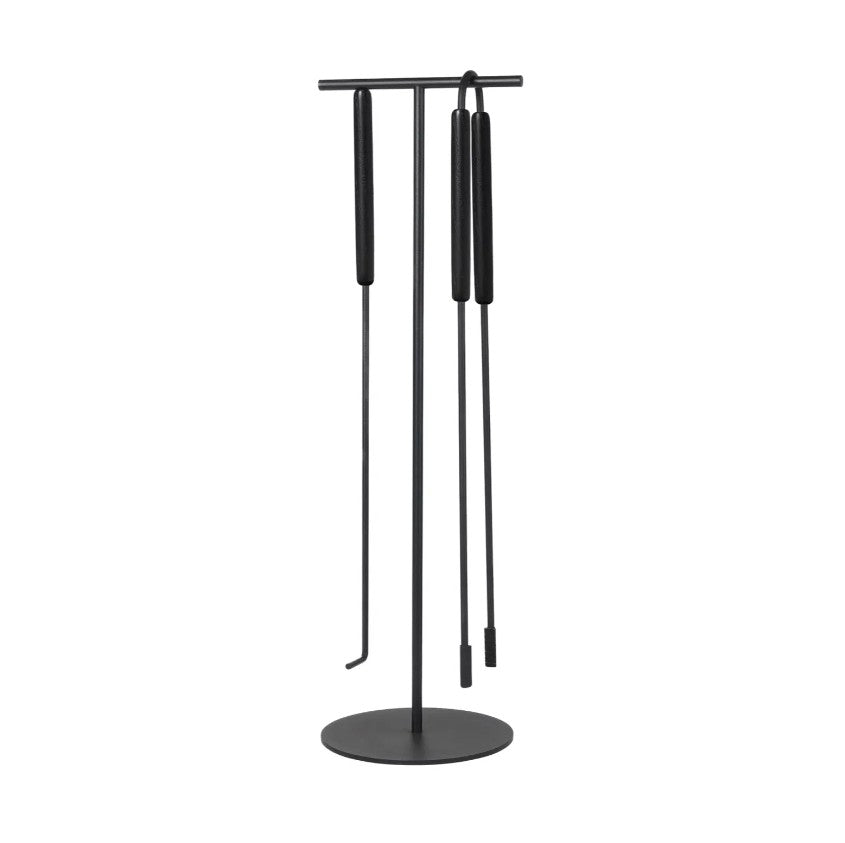 As a practical addition, the poker's wooden handle has a built-in magnet that holds the poker securely to the stand when not in use and makes the fireplace set a decorative item in your living room. The tools of the fireplace set seem to float on the crossbar of the matt powder-coated holder. The tongs are simply placed on top.