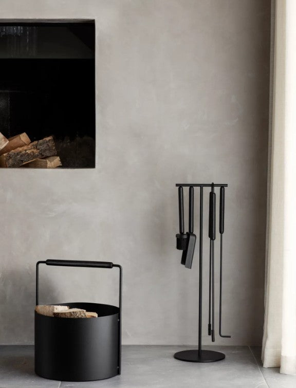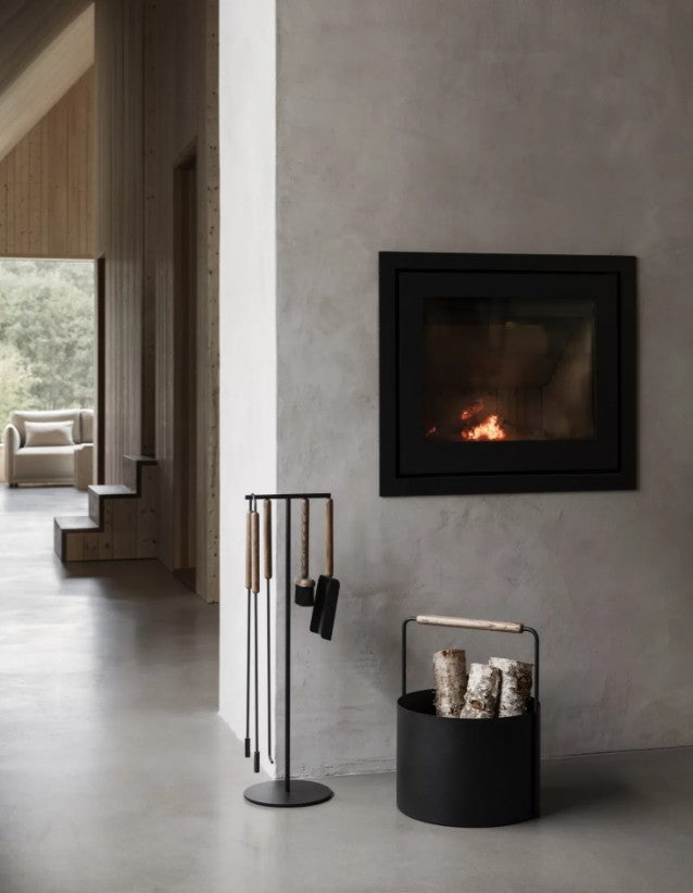 As a practical addition, the wooden handles have a built-in magnet that holds the set securely to the stand when not in use and makes the fireplace set a decorative item in your living room. The shovel, broom and poker of the fireplace set appear to float on the crossbar of the matt powder-coated holder. The tongs are simply placed on top.
