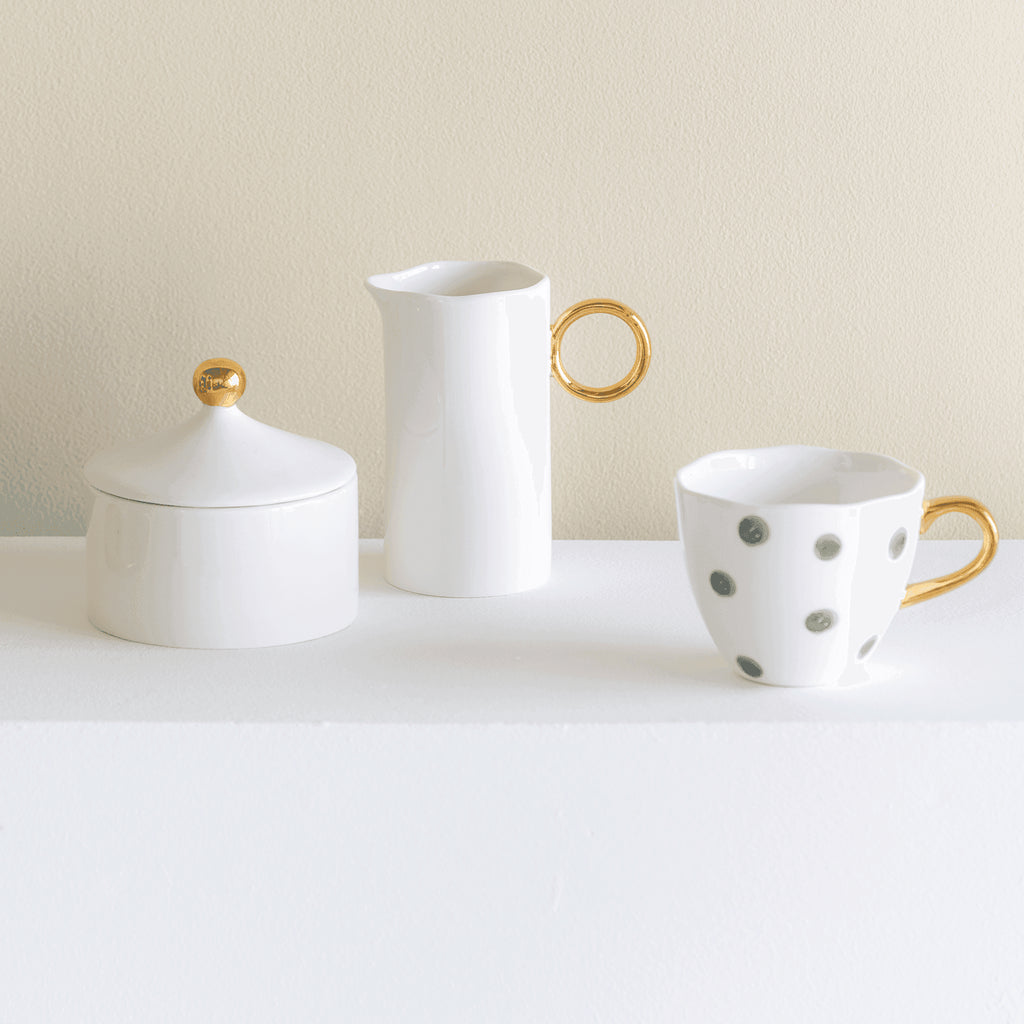 "The renowned Dutch artist once painted the exquisite 'Milk Maid' masterpiece, 'Het Melkmeisje'. If recreated today, it might showcase our elegant Good Morning Milk Can. Crafted from fine new bone porcelain with a unique wavy top and the iconic golden ear of Urban Nature Culture's Good Morning collection. A stunning addition to elevate your table setting.
