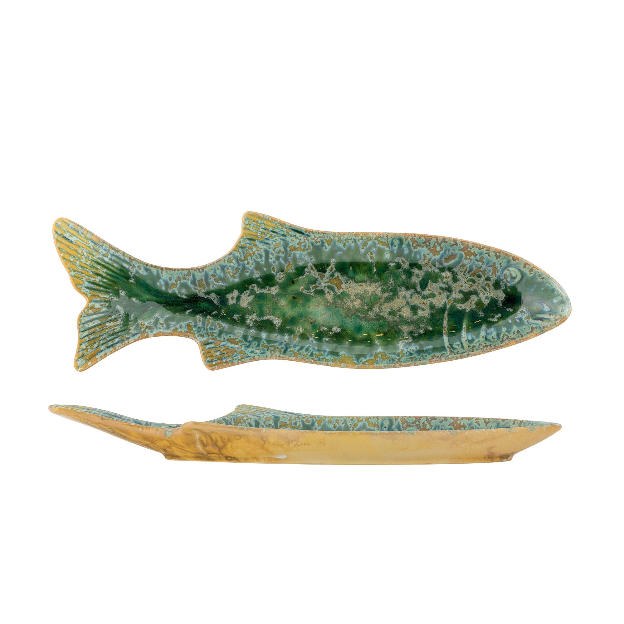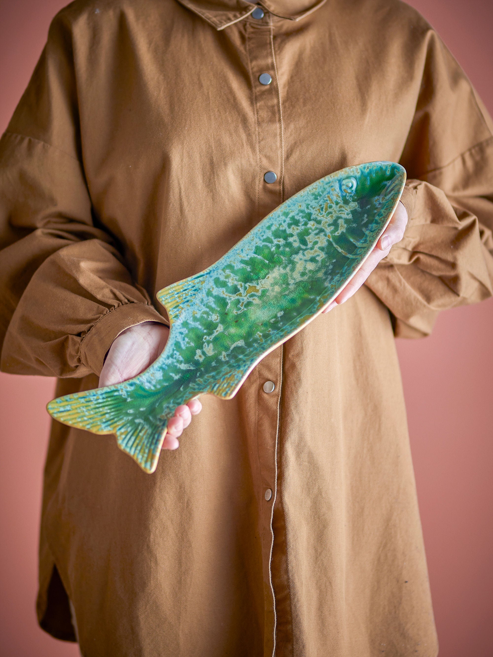 The Hadden Serving Plate by Creative Collection is made of stoneware and shaped like a fish. The green reactive glaze creates subtle color variations and gives a unique look to each dish. Perfect for small servings or as decoration.