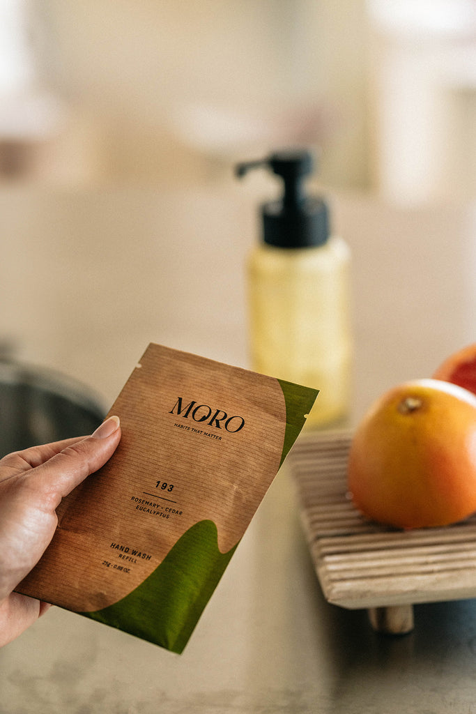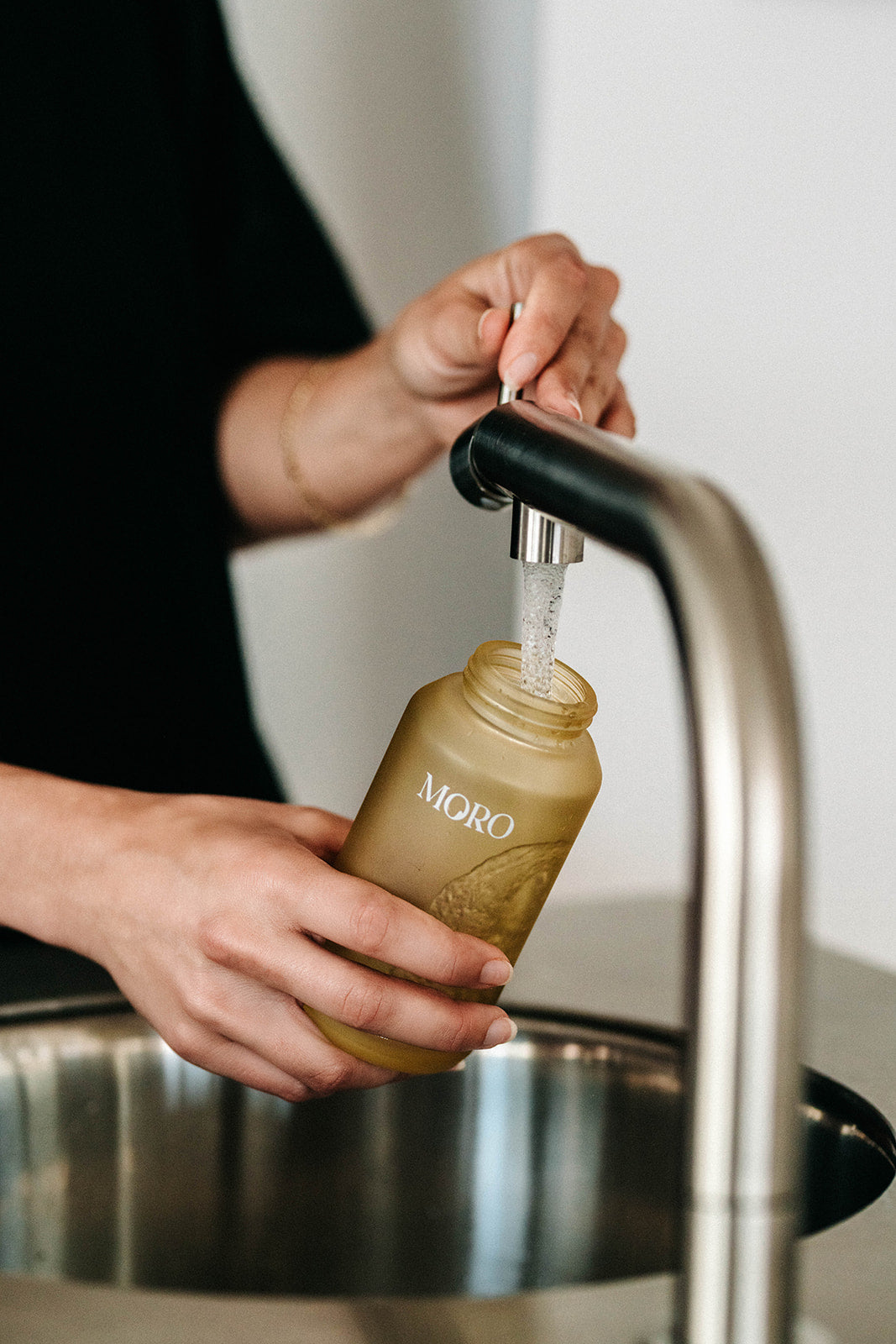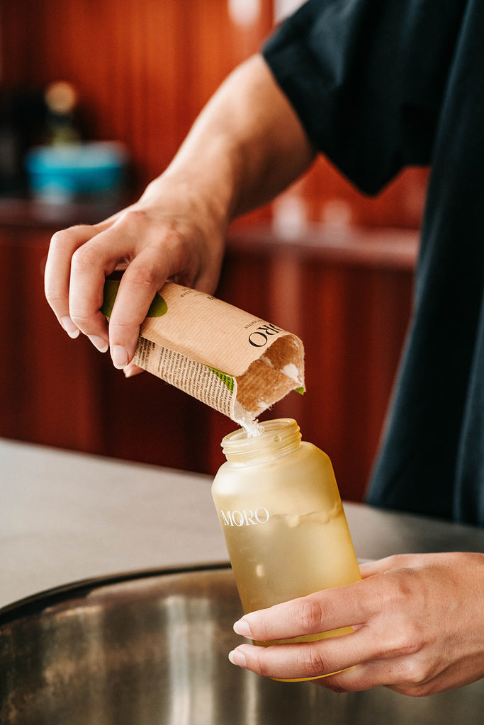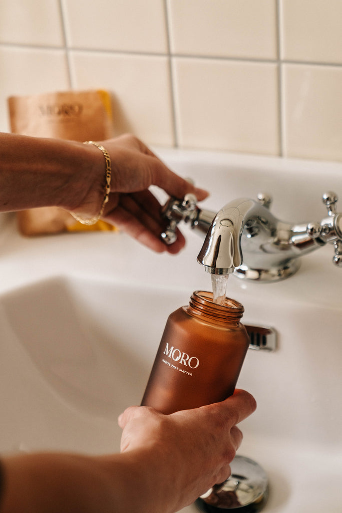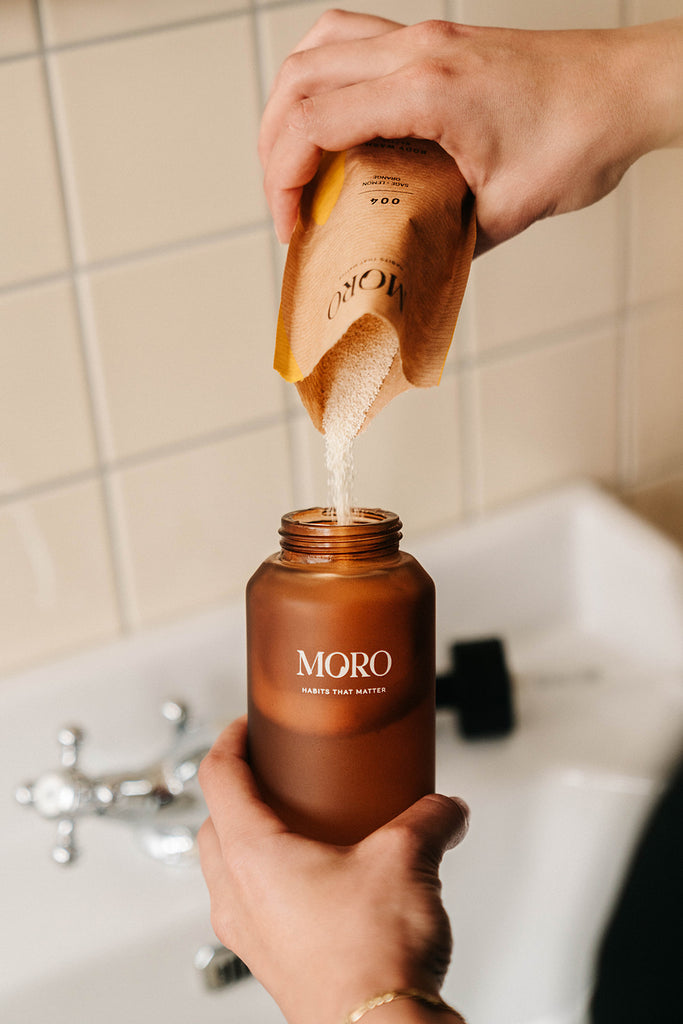 Our powder-to-gel Hand Wash helps you cut plastic waste easily. Just add tap water, shake, and you're good to go. Because why ship 80% water when you already have a tap at home? Our signature bottle are made from glass and designed to be refilled — again and again.