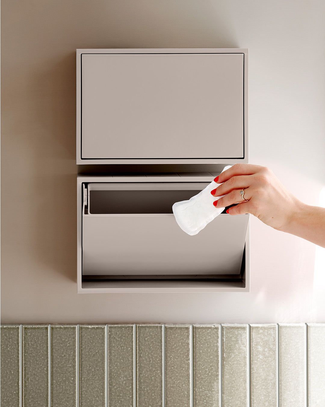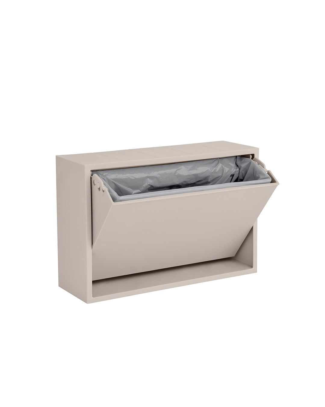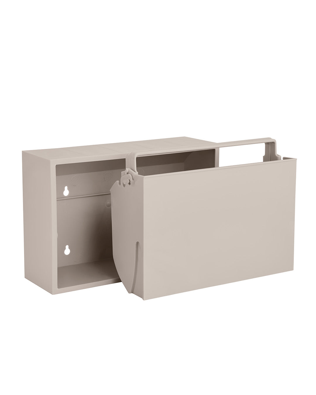 Our small storage box is perfect as a toilet bin or for keeping your small items organized in the bathroom or other rooms in your home. The box is designed as a practical solution, making it easy to hang on the wall, and its surface can also be used as a shelf for decorative items. Our small storage box is the perfect solution for organizing your small items in a stylish and practical way. The clever tipping function, which allows you to open the box by gently pressing the bottom, also adds to the convenience and functionality of this smart storage solution.The box is made of recycled plastic with added minerals, and we have chosen to produce it in Denmark to avoid long transportation distances.Its small size makes it perfect for storing, sorting, and organizing everything from hairpins and elastics to jewelry, children's markers, or other small items.