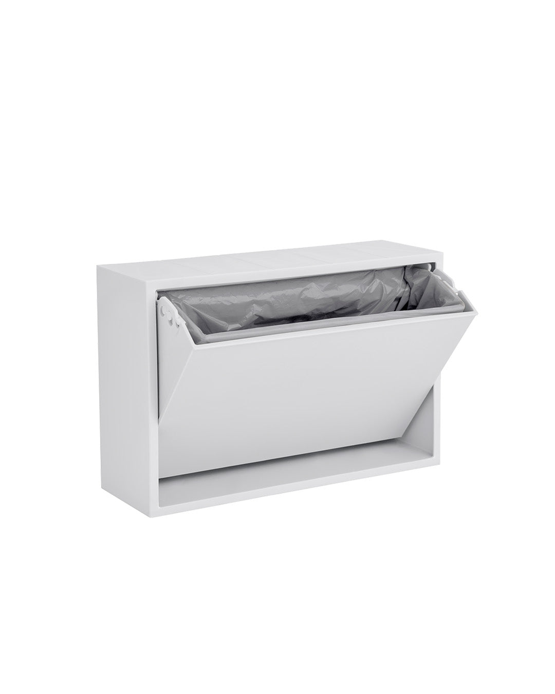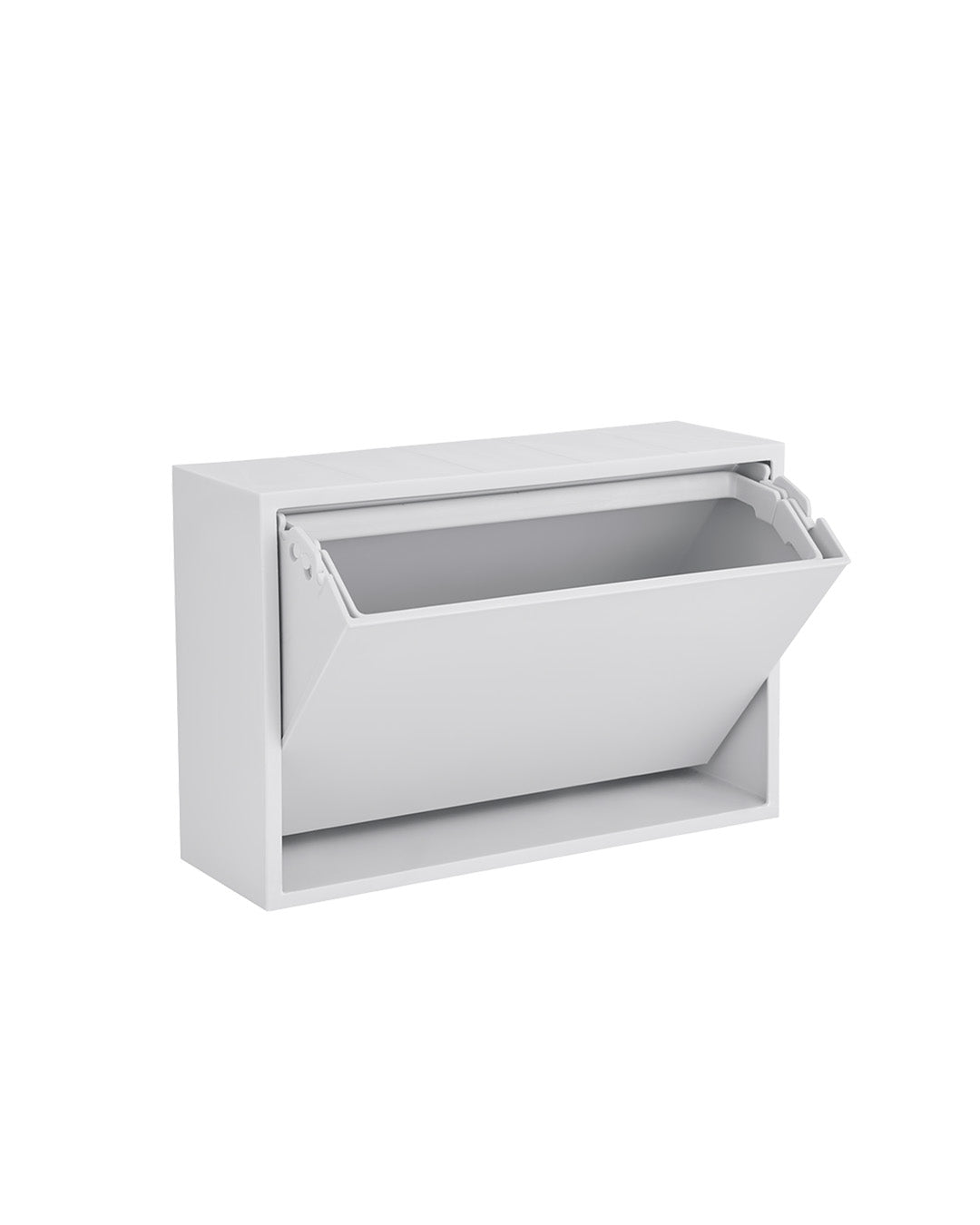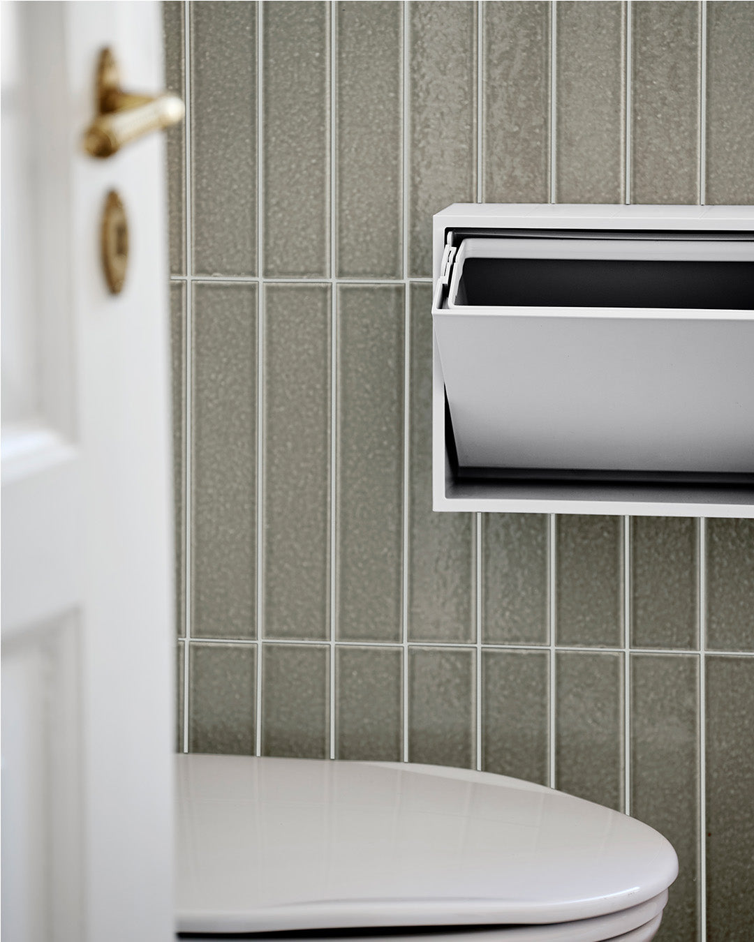 Our small storage box is perfect as a toilet bin or for keeping your small items organized in the bathroom or other rooms in your home. The box is designed as a practical solution, making it easy to hang on the wall, and its surface can also be used as a shelf for decorative items. Our small storage box is the perfect solution for organizing your small items in a stylish and practical way. The clever tipping function, which allows you to open the box by gently pressing the bottom, also adds to the convenience and functionality of this smart storage solution.The box is made of recycled plastic with added minerals, and we have chosen to produce it in Denmark to avoid long transportation distances.Its small size makes it perfect for storing, sorting, and organizing everything from hairpins and elastics to jewelry, children's markers, or other small items.