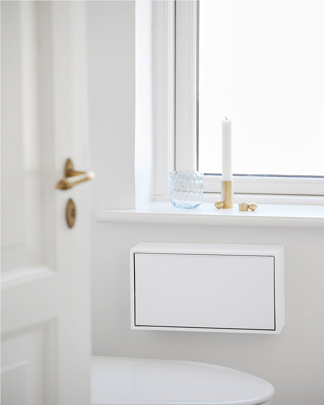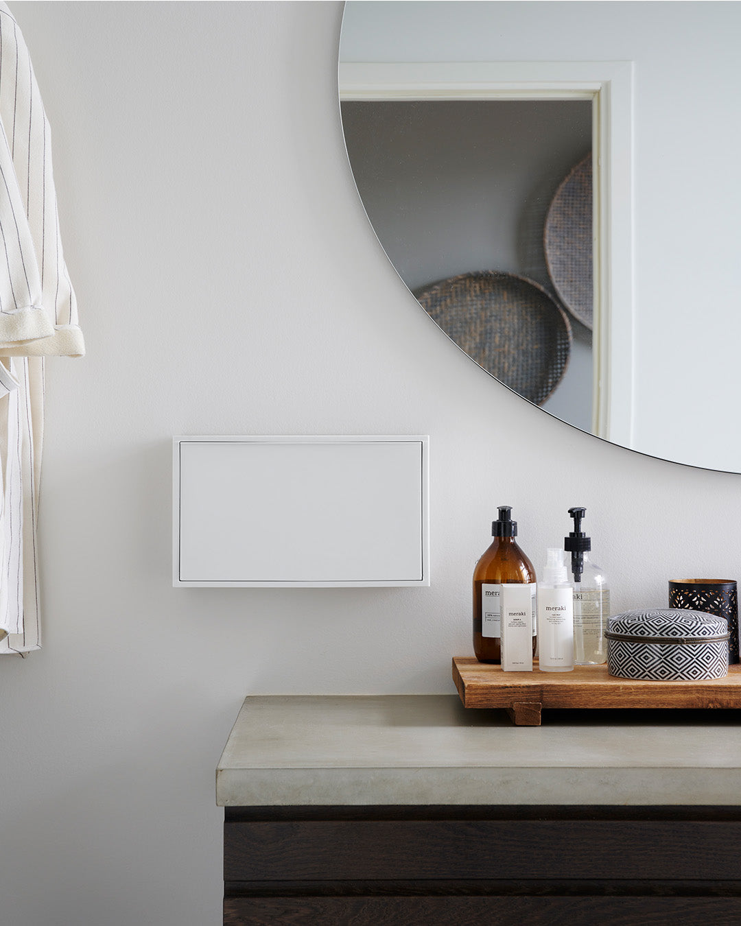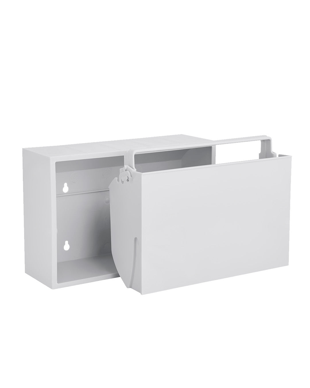Our small storage box is perfect as a toilet bin or for keeping your small items organized in the bathroom or other rooms in your home. The box is designed as a practical solution, making it easy to hang on the wall, and its surface can also be used as a shelf for decorative items. Our small storage box is the perfect solution for organizing your small items in a stylish and practical way. The clever tipping function, which allows you to open the box by gently pressing the bottom, also adds to the convenience and functionality of this smart storage solution.The box is made of recycled plastic with added minerals, and we have chosen to produce it in Denmark to avoid long transportation distances.Its small size makes it perfect for storing, sorting, and organizing everything from hairpins and elastics to jewelry, children's markers, or other small items.