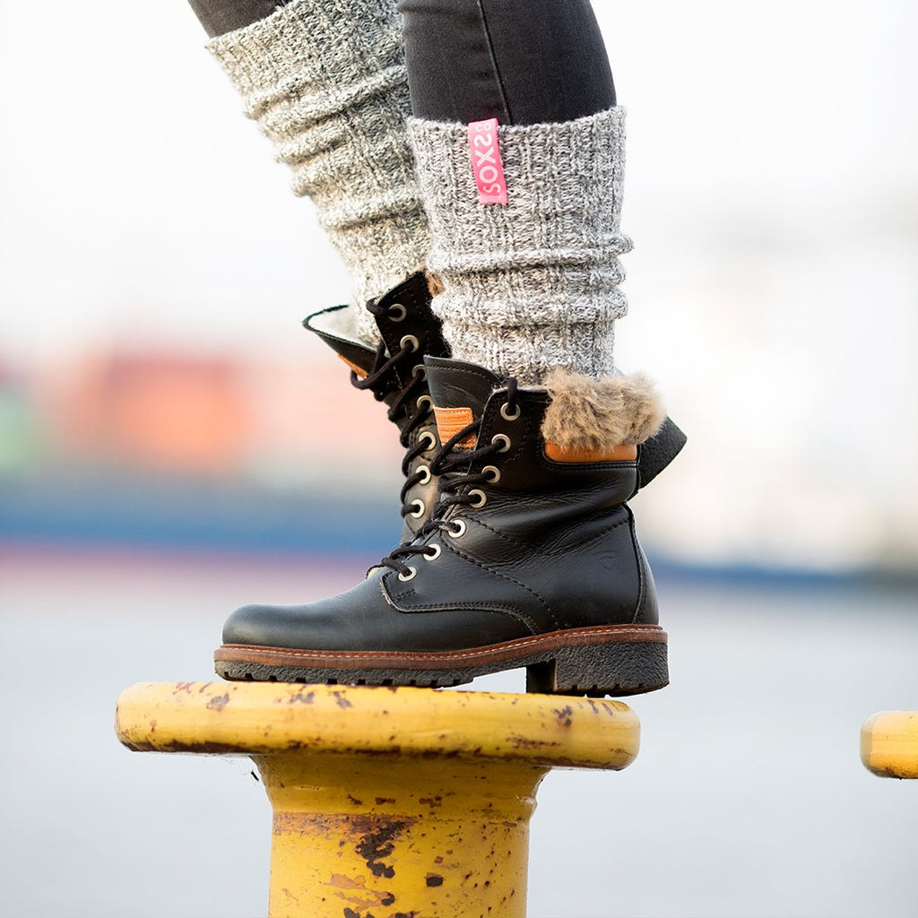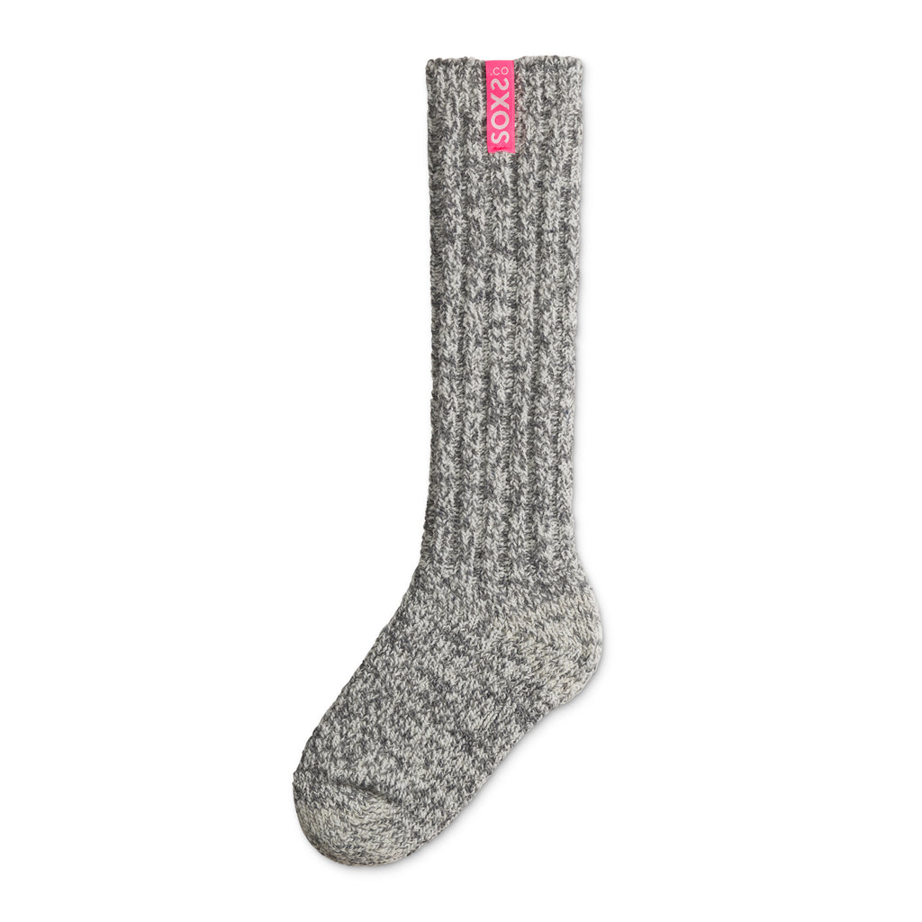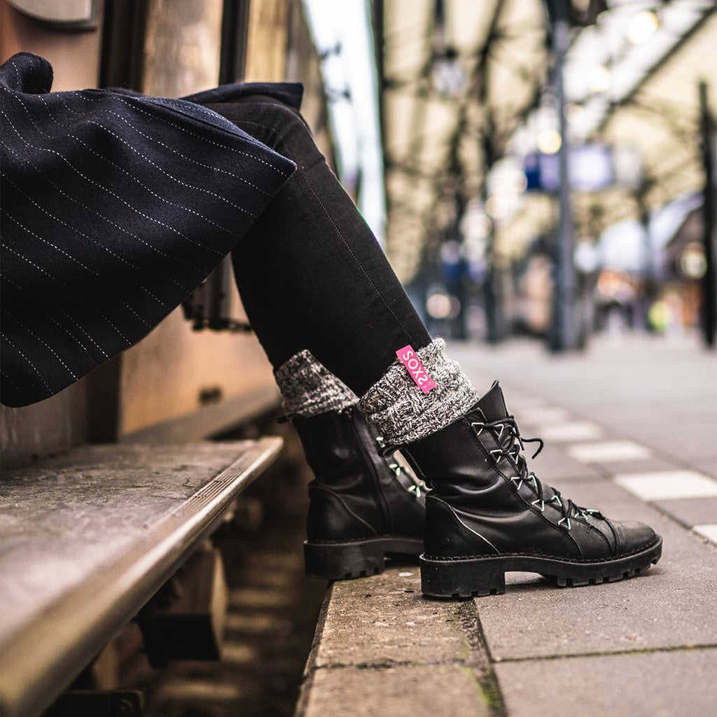 When it’s cold outside your feet will be toasty and warm in your grey wool knee-high socks for women with sweet Bubblegum label! These SOXS have a classic and timeless design with a trendy pink twist. The great length ensures that not only your feet but your legs stay warm this winter! The long socks rise to just below your knee and are great to wear with tall winter boots. And if you are in the mood to stay at home to read a book or to spend time with your family, these warm knee socks are your coziest friends! You’ll enjoy the incredibly soft feel of our animal-friendly wool. These winter socks provide a high level of wearing comfort thanks to their excellent breathability, thermoregulation and moisture-wicking properties. SOXS‘ grey wool knee socks for women are your ideal companion throughout the day. Whether you go skiing, stroll through the city or stay at home.