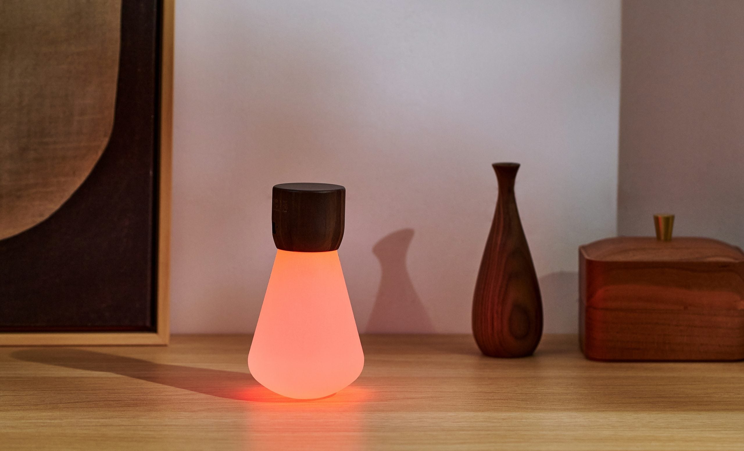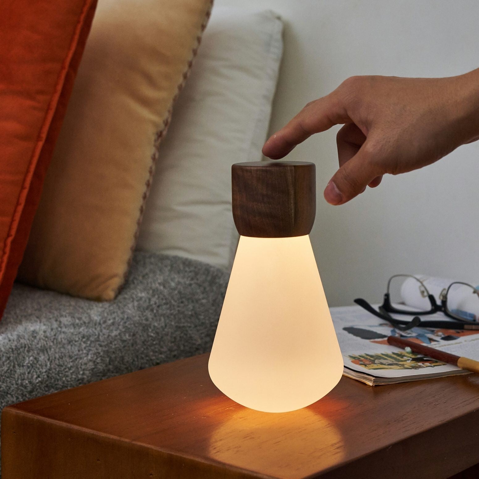 The light comes through the Premium Frosted Acrylic Glass, ensuring an even and more prominent glow. All bulbs have a solid wooden part , which comes in Walnut and White Ash Wood finishing.
