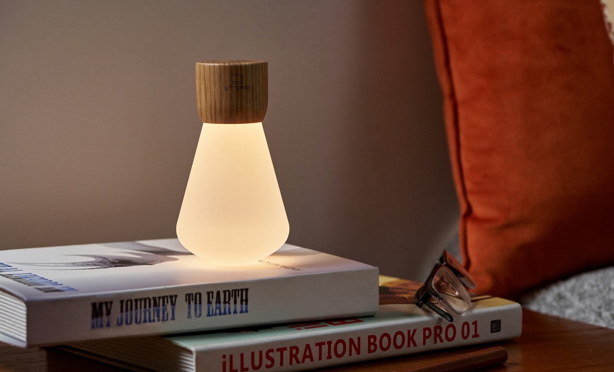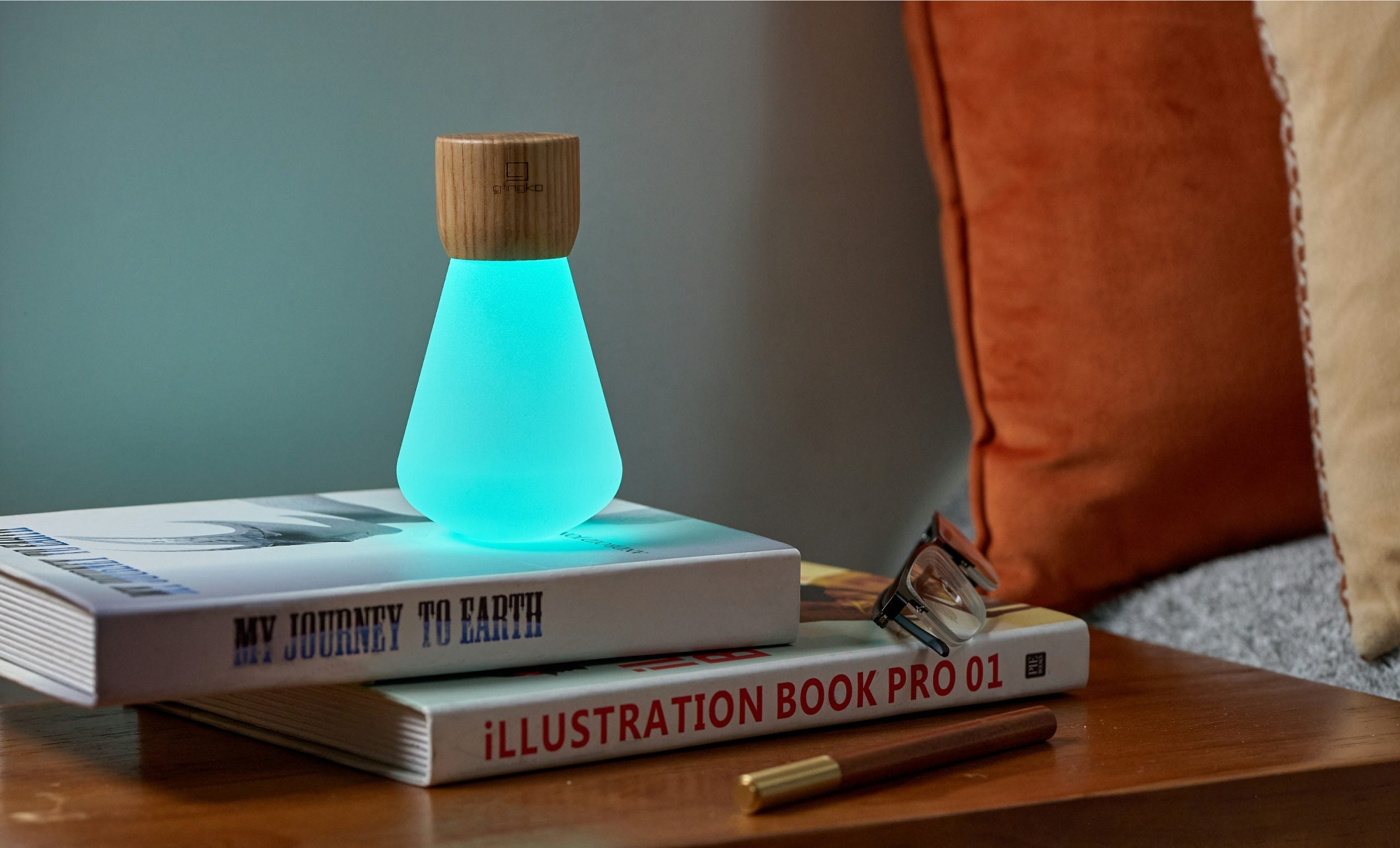You can switch between the 7 rotating soft RGB lights and white warm light mode with a gentle tap on the wooden piece. Since the large bulbs produce a lot stronger light, you can also dim it by pressing and holding the touch-sensitive wooden top.