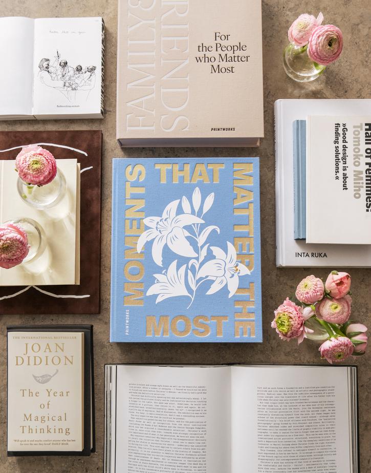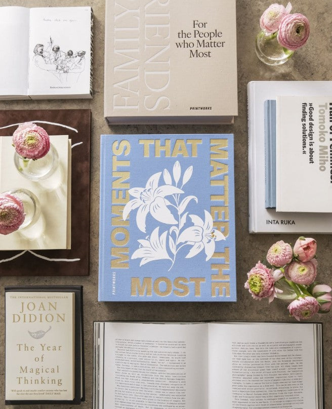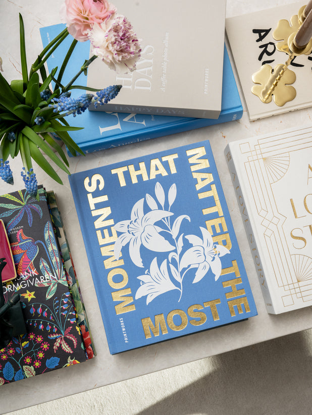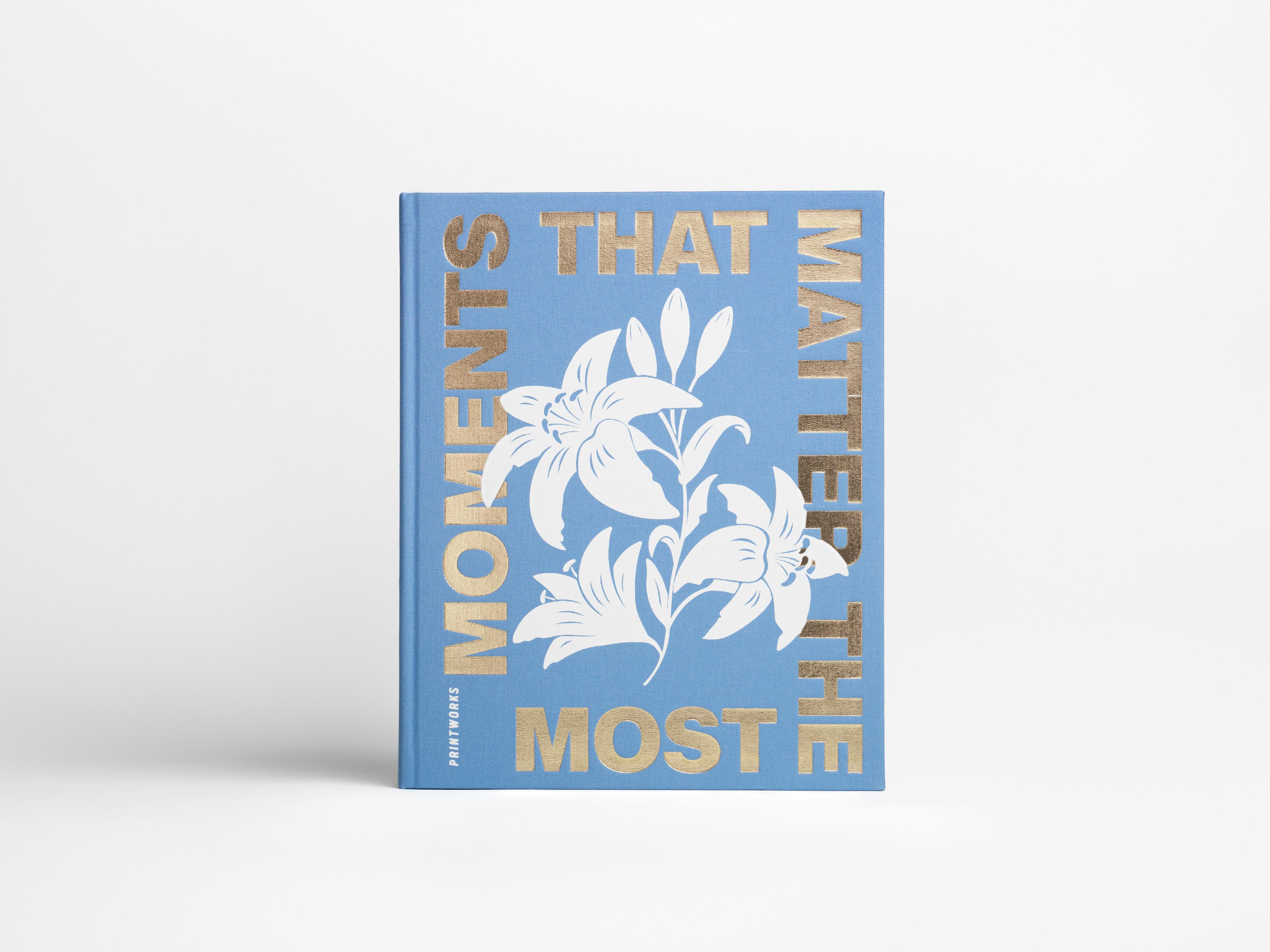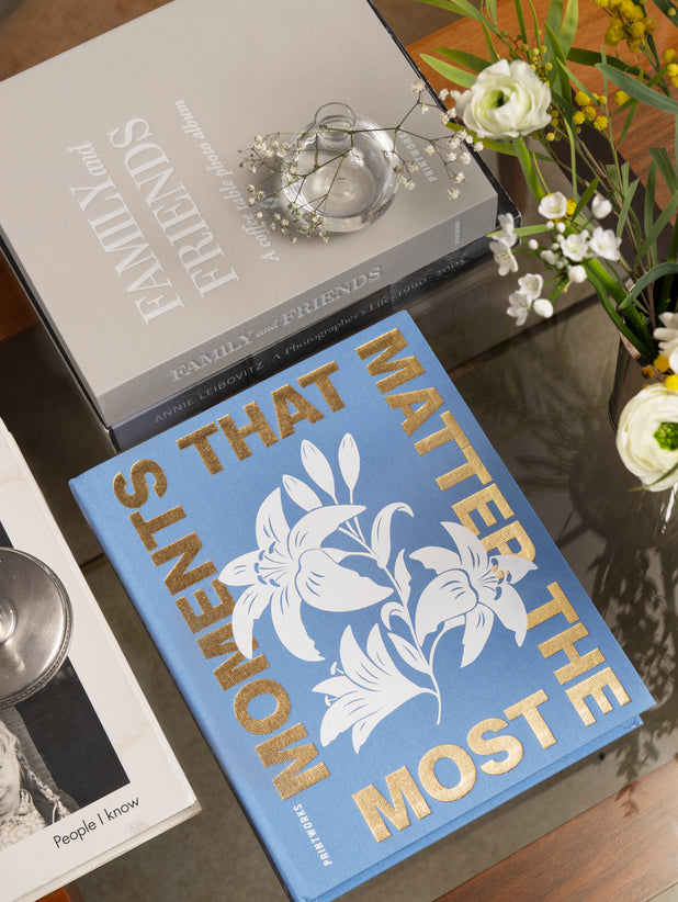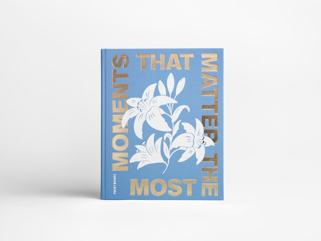 Discover our bestselling Moments that Matter the Most coffee table photo album, featuring an elegant sky blue cloth cover with gold foiled text.