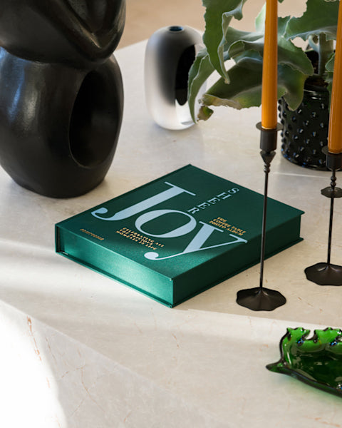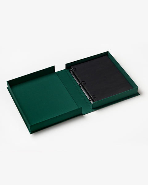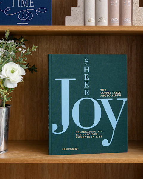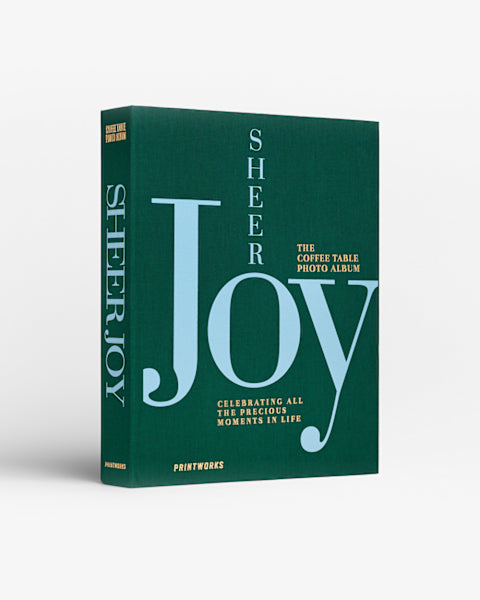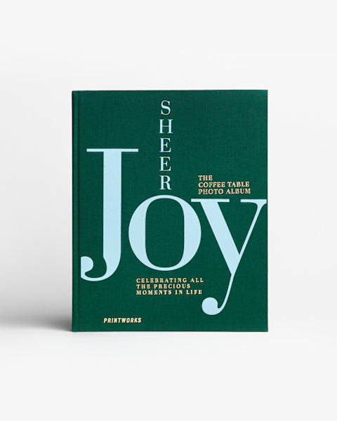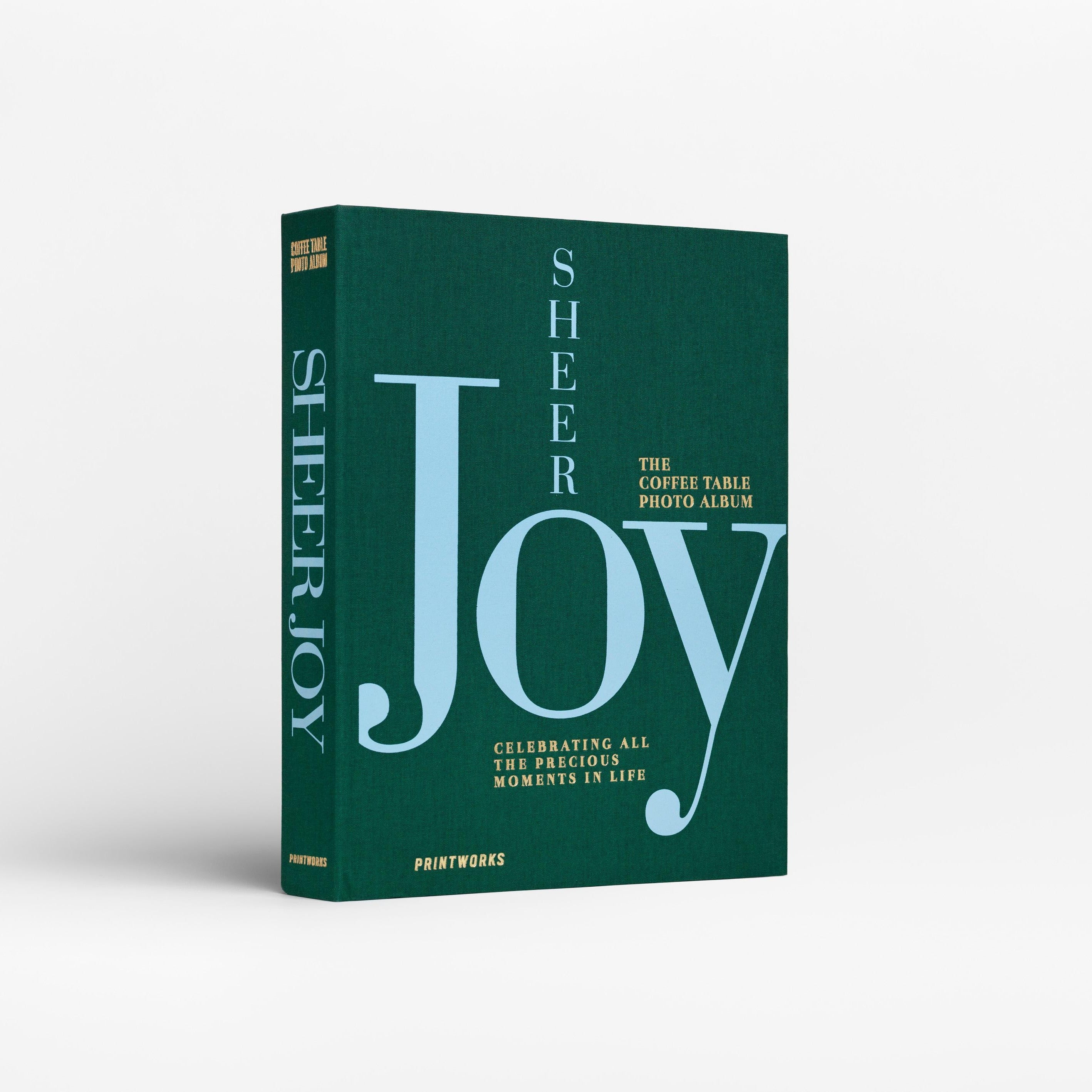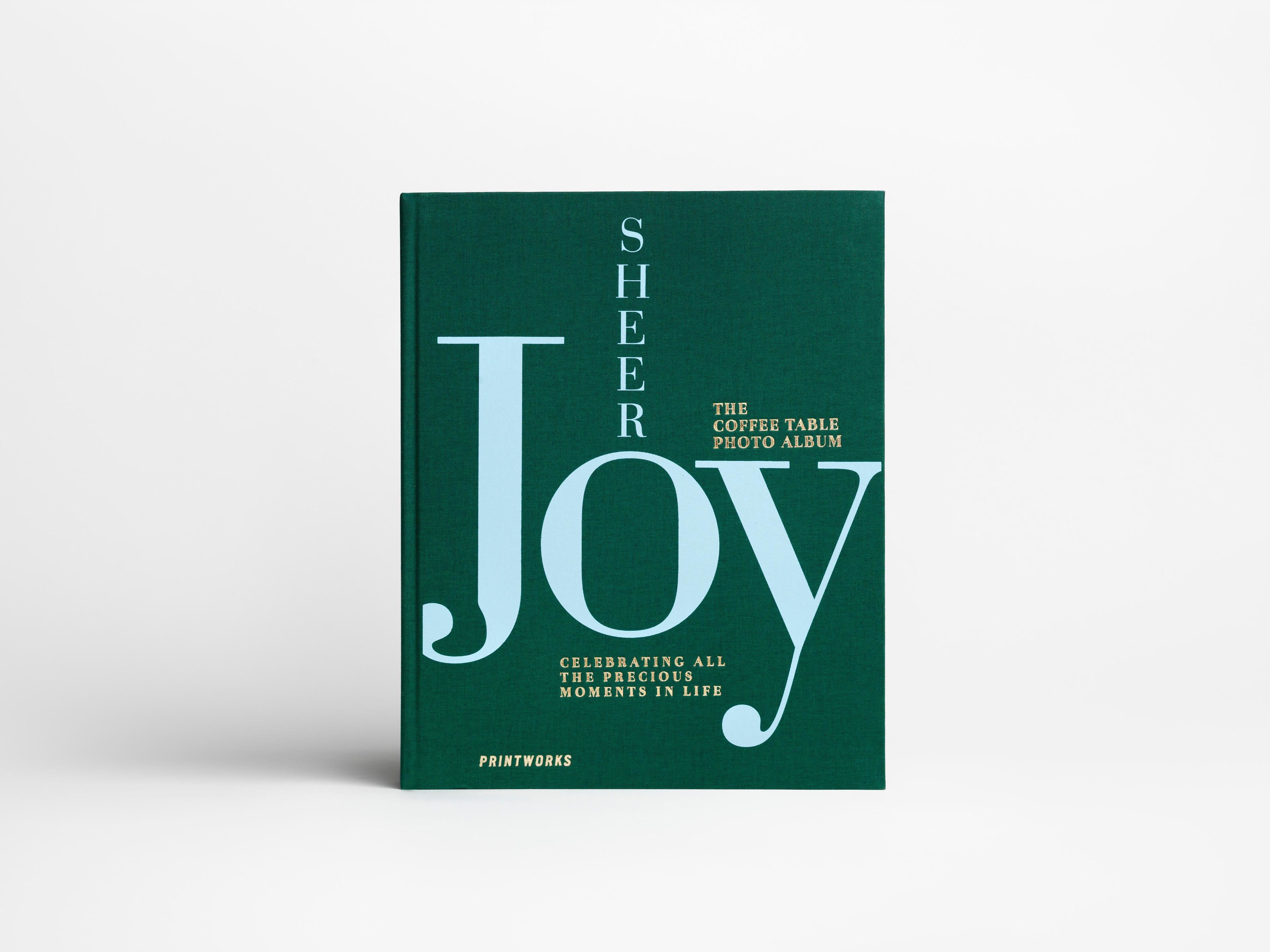 Discover our Sheer Joy coffee table photo album featuring an elegant, forest green cloth cover with blue foiled text.