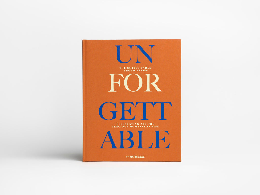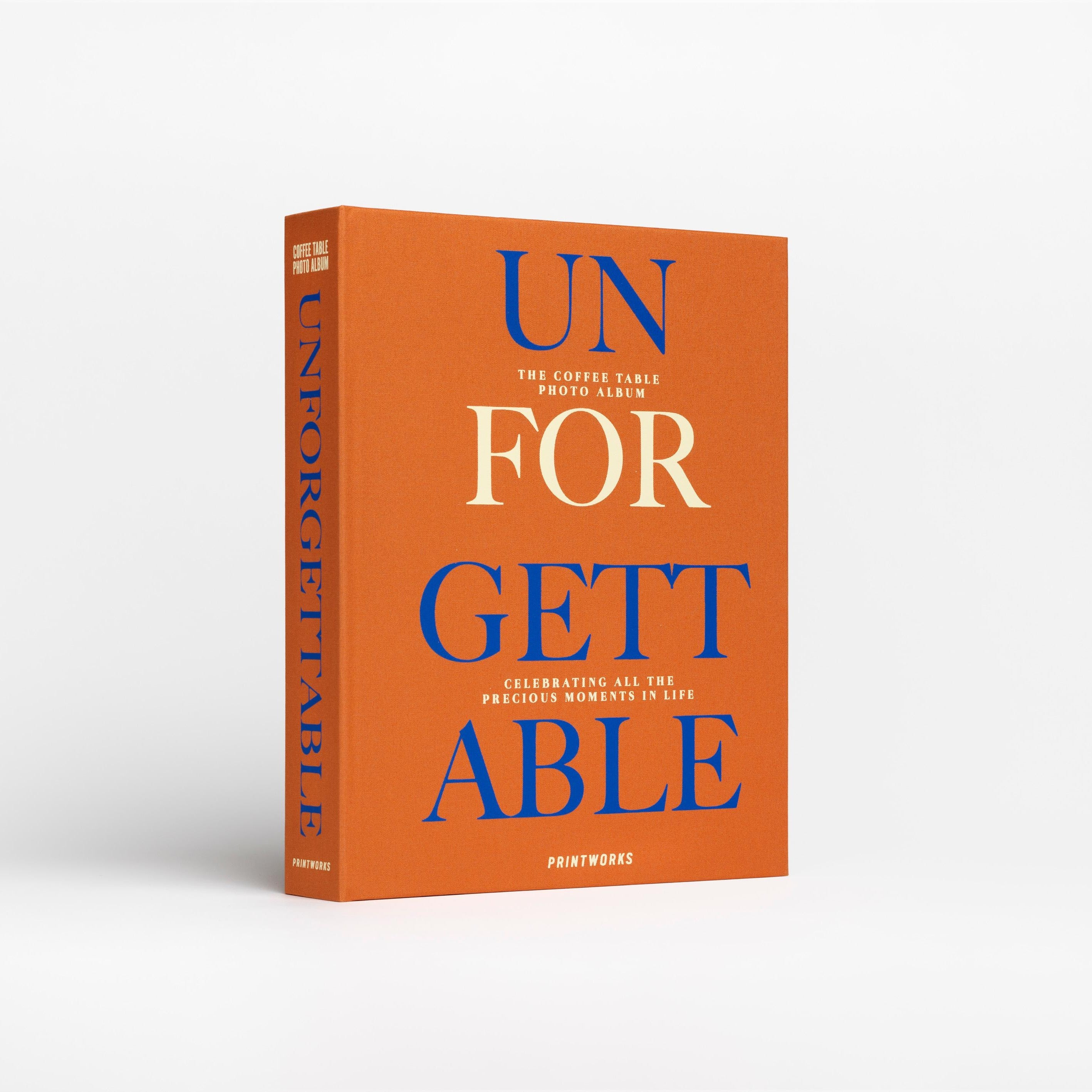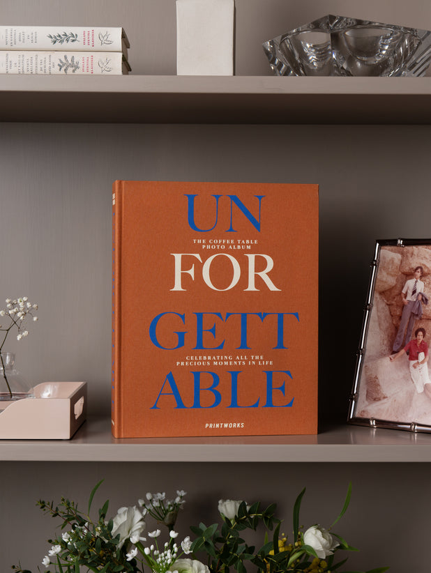 Discover our Unforgettable coffee table photo album featuring an elegant, terracotta cloth cover with blue and cream-white text.