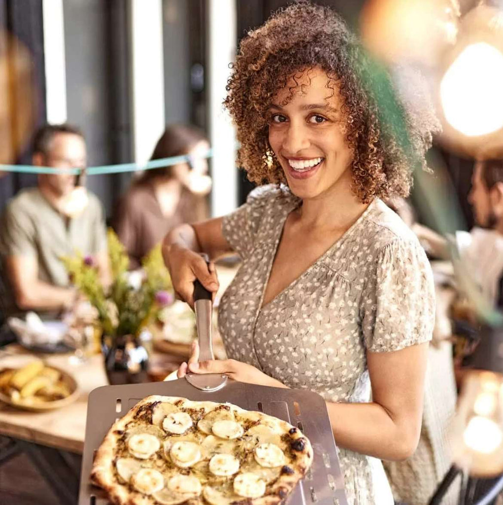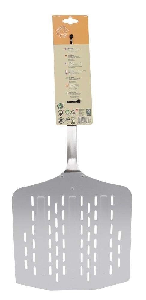 "The Cozze Pizza Peel with Holes is an essential tool for any pizza enthusiast. With a length of 66cm and a sturdy aluminum design, this pizza peel is perfect for safely and easily maneuvering pizzas in and out of the oven. The holes in the peel allow excess flour and moisture to be easily drained, keeping your pizza perfectly crispy. Made of high-quality aluminum, stainless steel, and polypropylene, this peel ensures durability and long-lasting use. Choose the Cozze Pizza Peel with Holes and savor delicious homemade pizzas!"