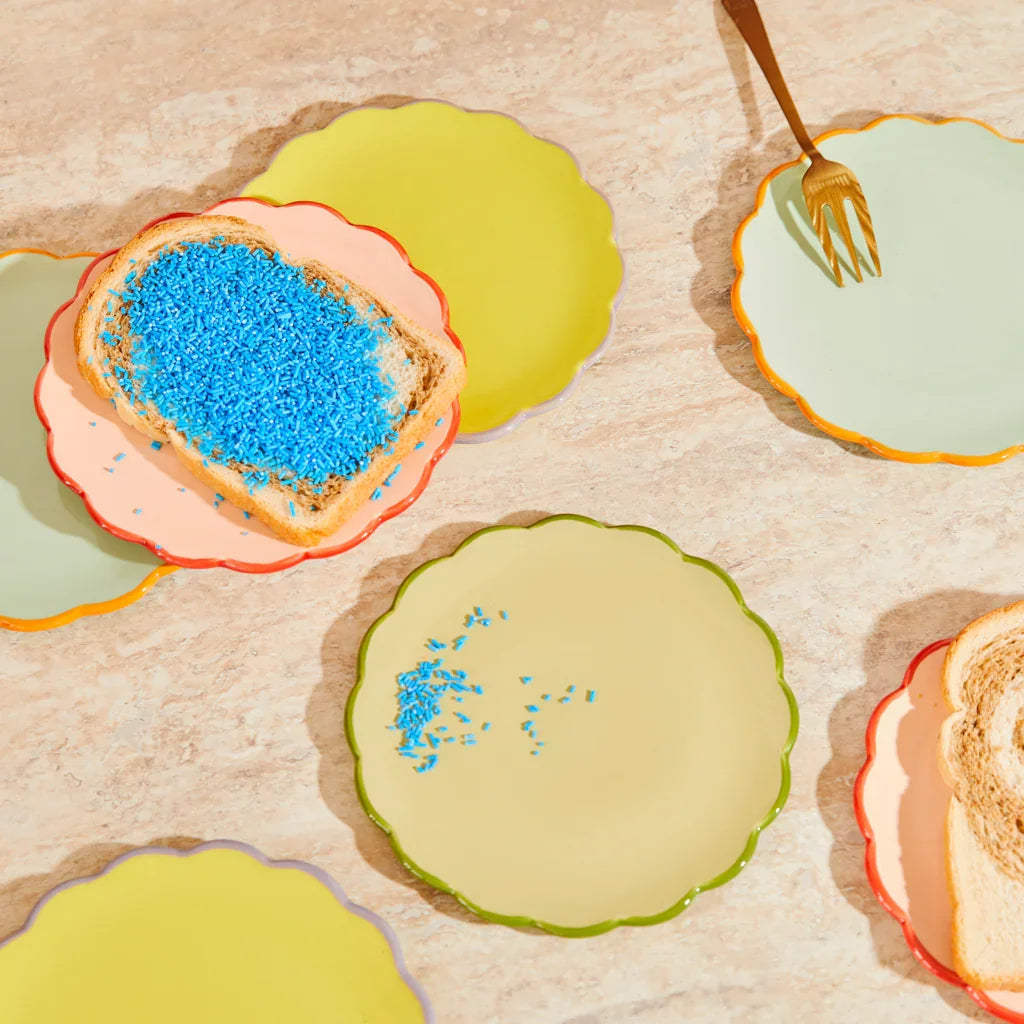 Discover our beloved Good Morning collection. The sculpted breakfast plate, featuring a vibrant celadon and orange rim, adds a touch of contrast to your table. Made of ceramic, it is both stylish and durable. This cheerful piece is dishwasher safe, making it a convenient choice. Mix and match with other items from the Good Morning series for a coordinated look.
