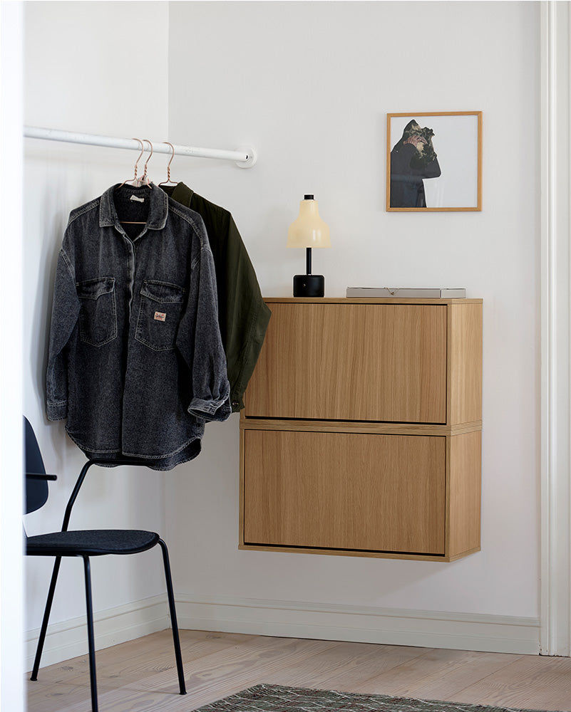 Our shoe boxes are the perfect solution for organizing your shoes in a stylish and efficient way. Available in six different versions – five beautiful colors and an oak veneer – each box can hold 6–8 pairs of shoes, giving you plenty of space for sneakers, boots, and elegant shoes.