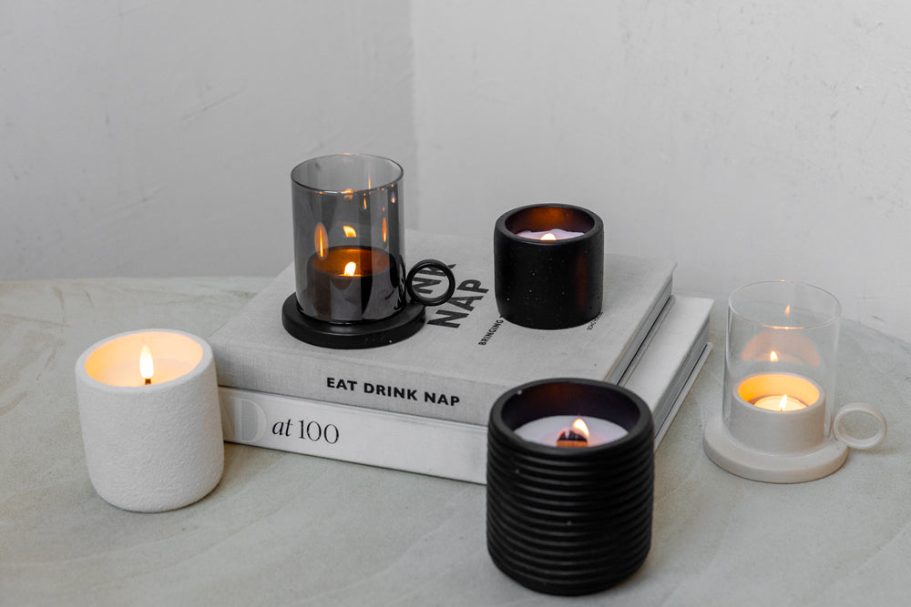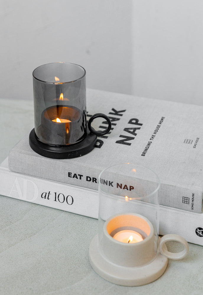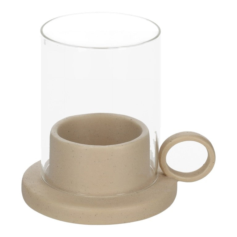 This ceramic tea light holder has a handy handle on the side. This makes the tea light holder easy to move and gives it a contemporary look. The candlelight is spread throughout the room by the glass cylinder.