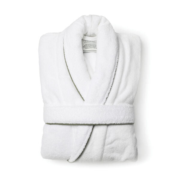Luxurious robe in 100% cotton. The robe is a classic model with an extra wide collar and belt at the waist. It also has several nice details, such as enclosed seams and contrasting piping on the collar. Made of a long cotton fibre with untwisted threads. The result is an incredibly soft robe that you'll never want to take off.