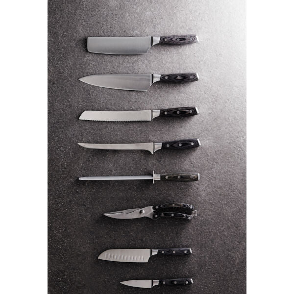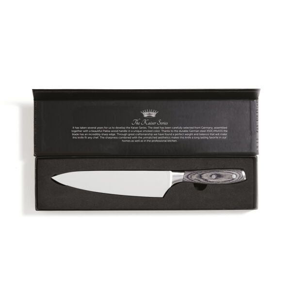 Chef's knife made of X50CrMoV15 German steel with a Pakkawood handle. The easy-grip handle and superb balance in the blade makes the knife comfortable and easy to work with. Size: 20 cm blade.