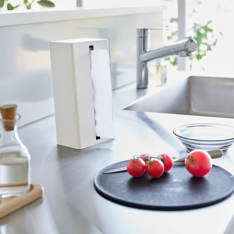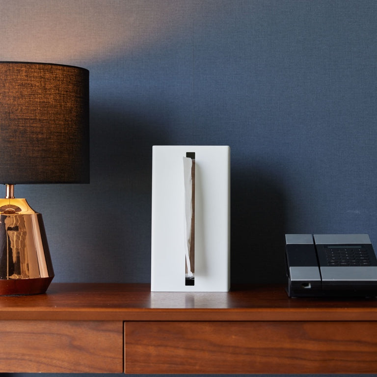 This tissue holder from Yamazaki features a vertical design, optimizing space. It allows for easy refill through a convenient bottom opening.