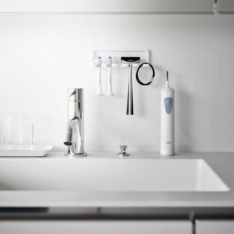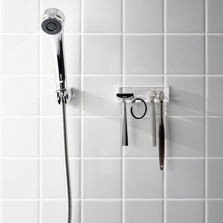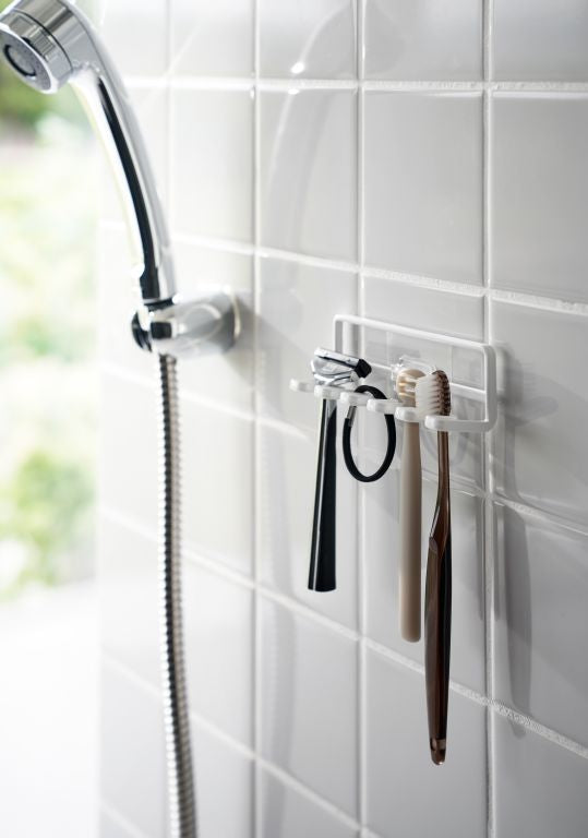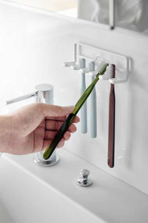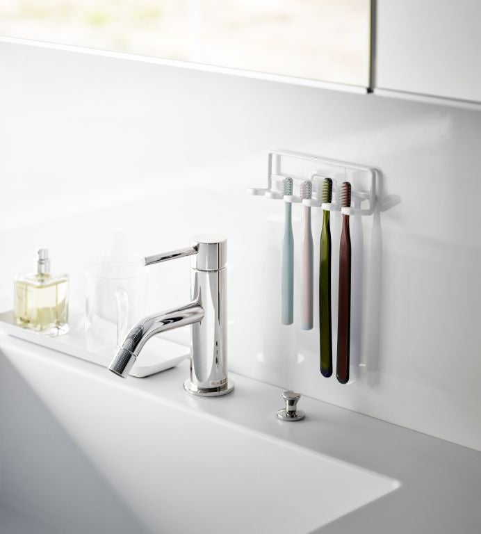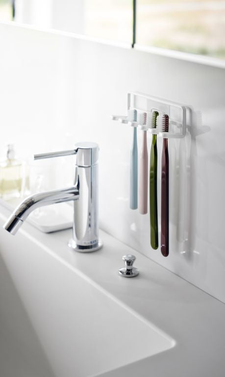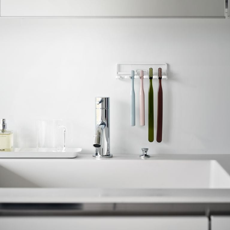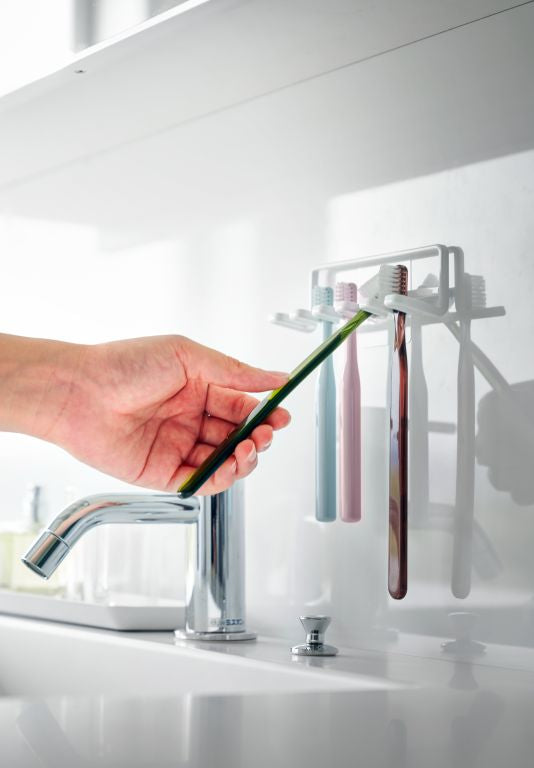 In small spaces, space-saving organizers are essential, making this toothbrush holder from Yamazaki very convenient. Its slim design allows space for 5 toothbrushes or other items like razors and small accessories. Easily mount the minimalist rack on the wall using the included hooks. Installation is a breeze: clean the wall, stick the hook on a flat surface, and snap the toothbrush holder in place.