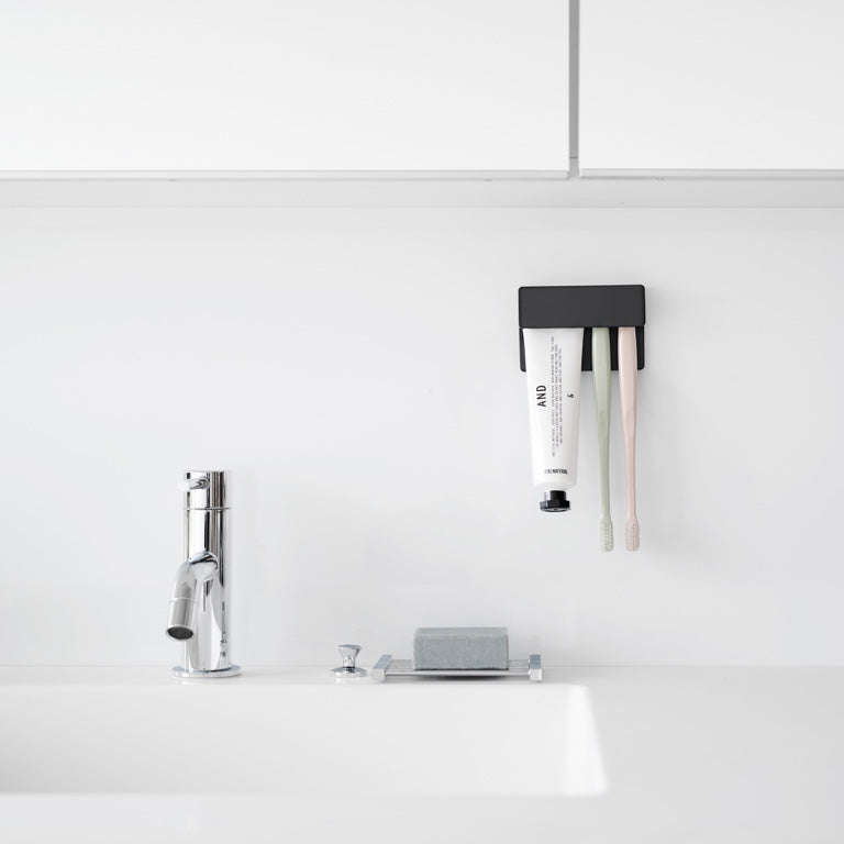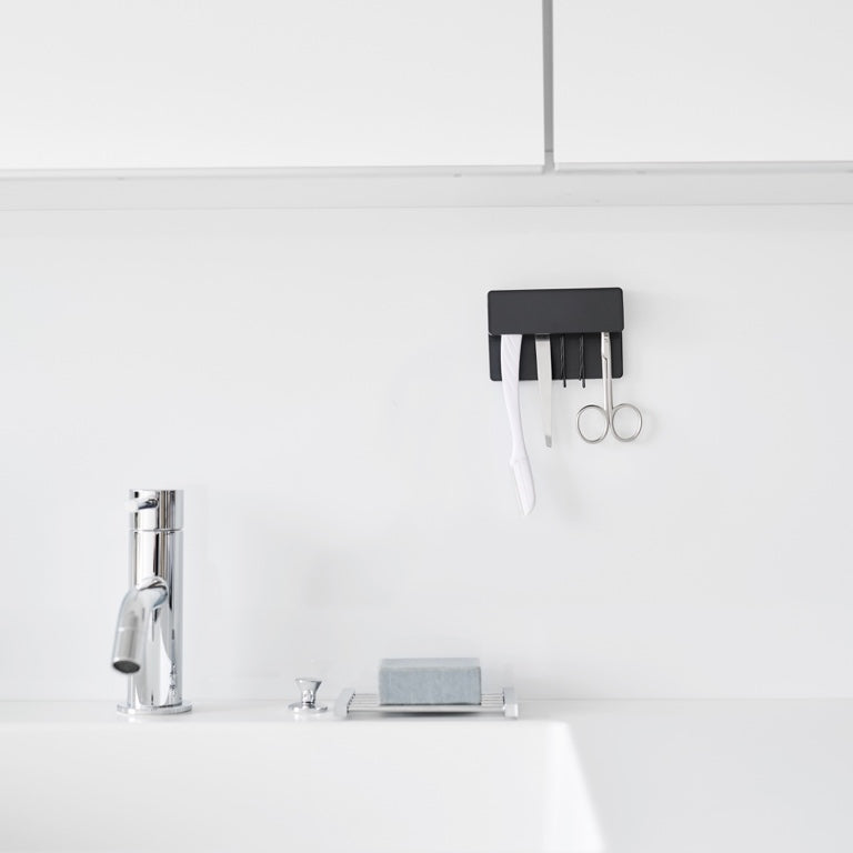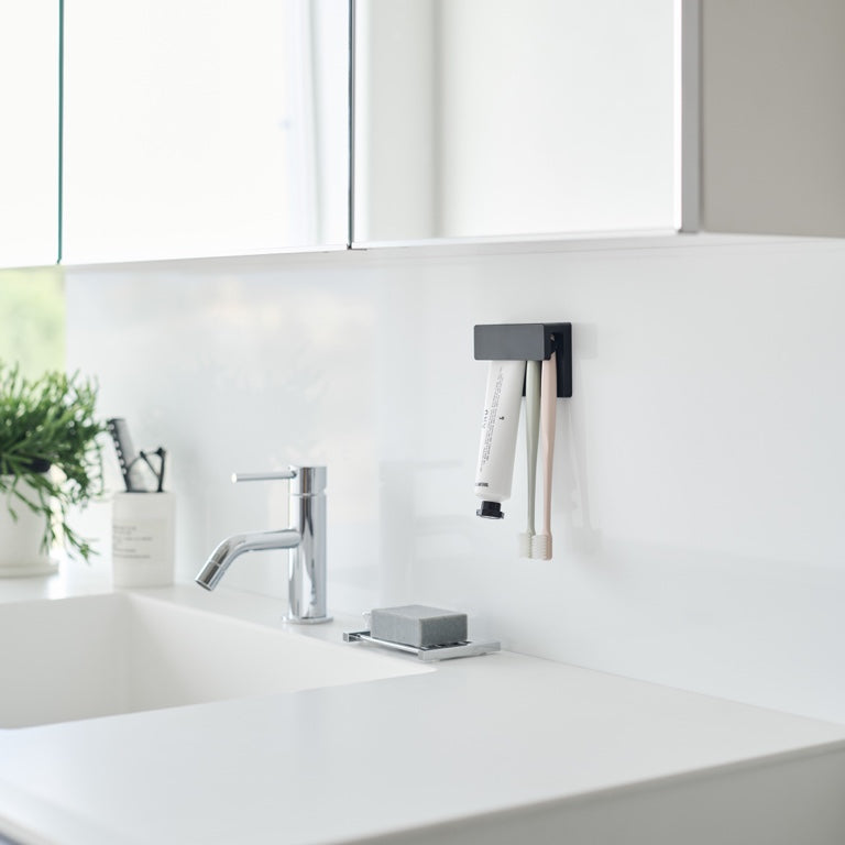 This Yamazaki holder provides a neat storage solution for toothbrushes and toothpaste. The practical design allows the items to hang upside down for quicker drying, ensuring hygiene. Easily mount the holder on the wall using the included adhesive hooks.