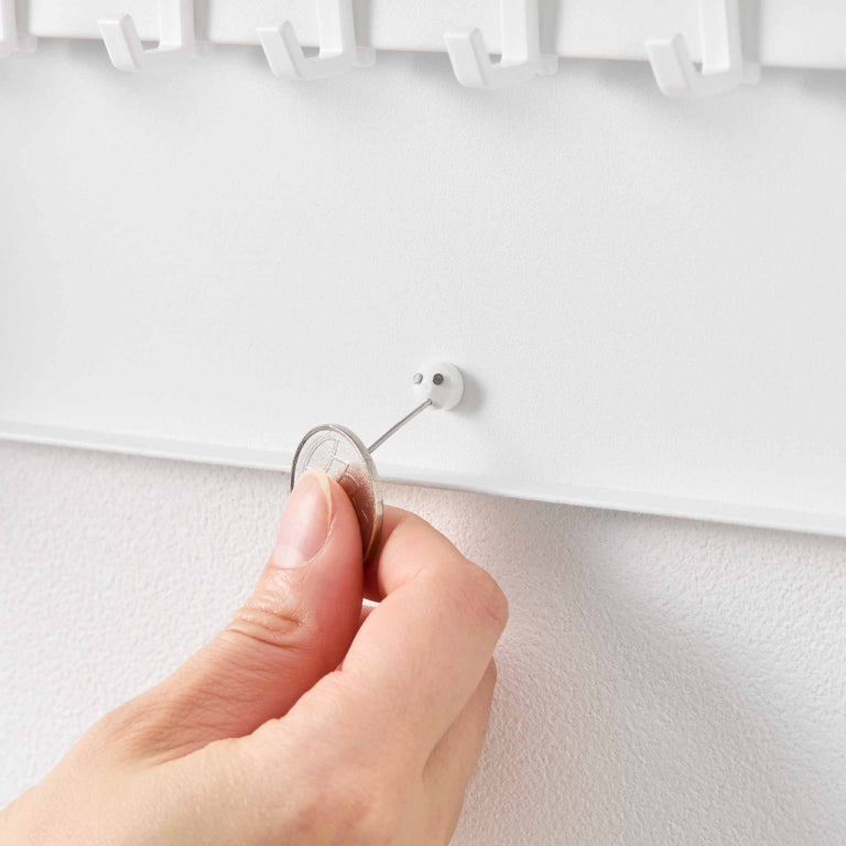 Steel construction with a discreet hinged lid for secure storage. Easy wall mounting using included pins or screws; includes eight adjustable hooks. Maximum load capacity: 2 kg total (250 g per hook).
