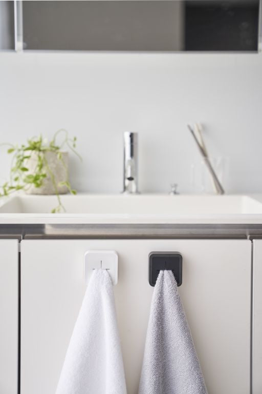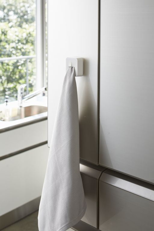 This handy towel holder by Yamazaki offers a simple and compact solution for hanging towels and dishcloths. It can be effortlessly mounted on the wall with the included adhesive hook. Once the hook is securely attached to a smooth, flat surface, the towel holder can easily be clipped on. The slim design of the holder allows for multiple towel holders to be attached side by side, enabling you to create additional hanging space easily. Please note: this product is sold individually.