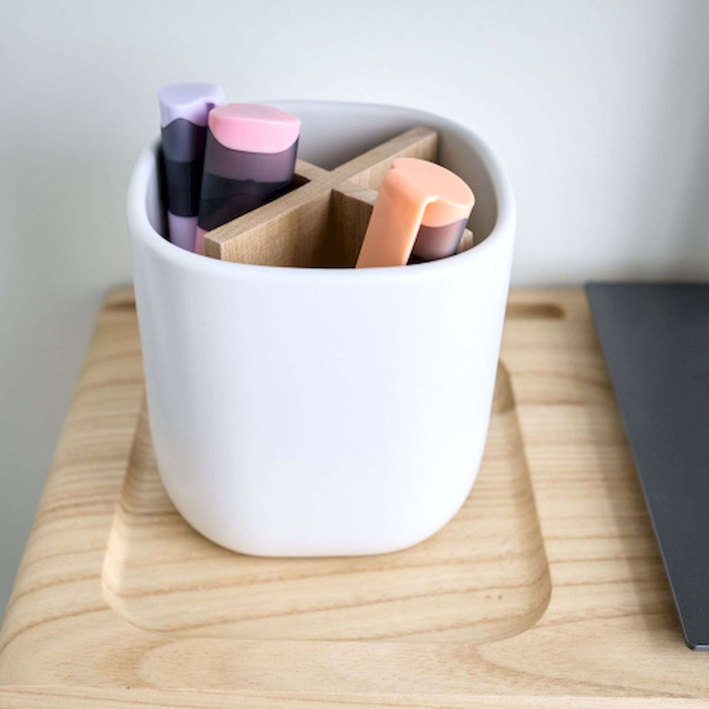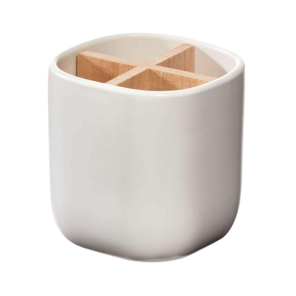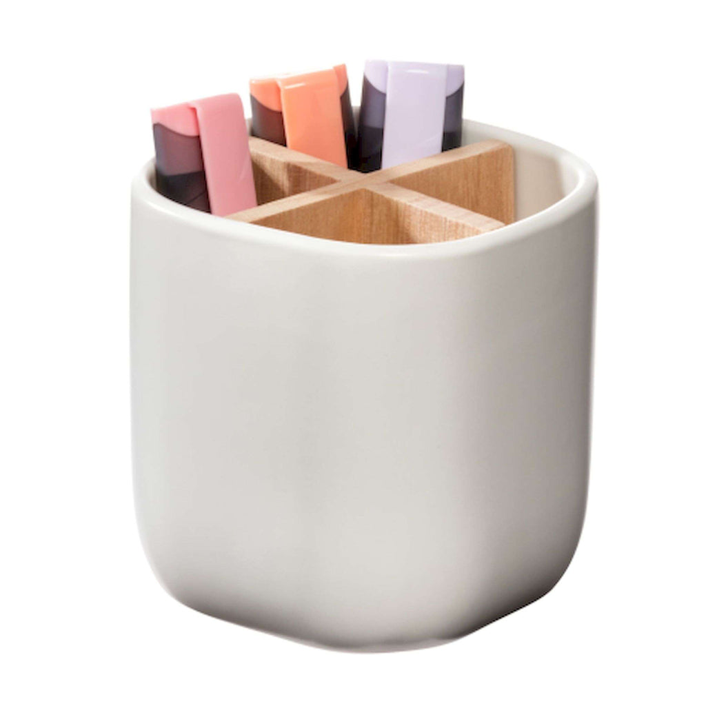 Experience the joy of an organized desk with the Eco Office Storage Cup with Compartment, part of the iDesign product series. This white and brown storage cup measures L. 10.2 x W. 10.2 x H. 10.4 cm, providing space for all your essential office supplies. The compartment allows you to easily categorize and keep your belongings within reach. Made from durable ceramic, this storage cup is sturdy, while the paulownia wood gives it a stylish and natural appearance, making it the perfect addition to any desk. Stay organized and stylish with the Eco Office Storage Cup with Compartment from iDesign.