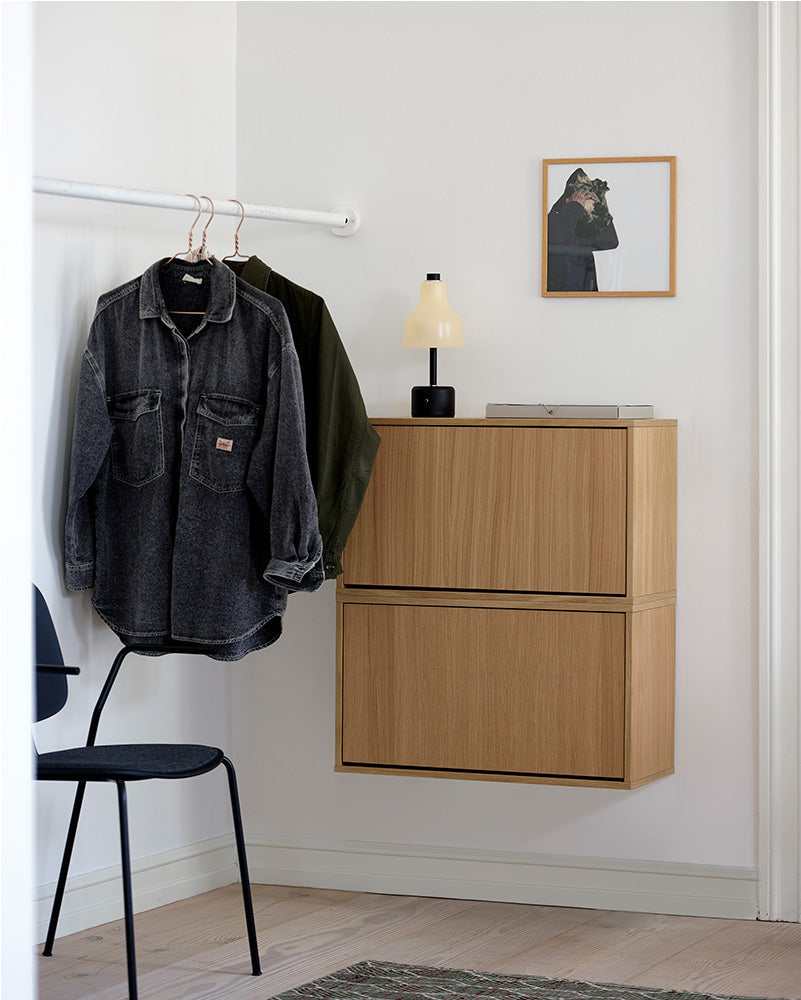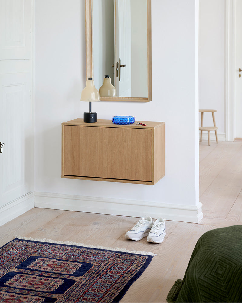 ReCollector Shoe Box — a modular, wall-mounted storage unit crafted in Denmark from FSC-certified wood. Available in five colors and oak veneer, each 70×40×30 cm box holds 6–8 pairs and closes with a discreet push-lock. Stackable and combinable, it frees floor space, offers a usable top surface, and integrates with our storage range. Delivered flatpack to reduce transport emissions; simple assembly with included guide. Durable finish (gloss 30); clean with a soft damp cloth and mild soap. Elegant, practical organization for entryways, wardrobes and utility rooms.