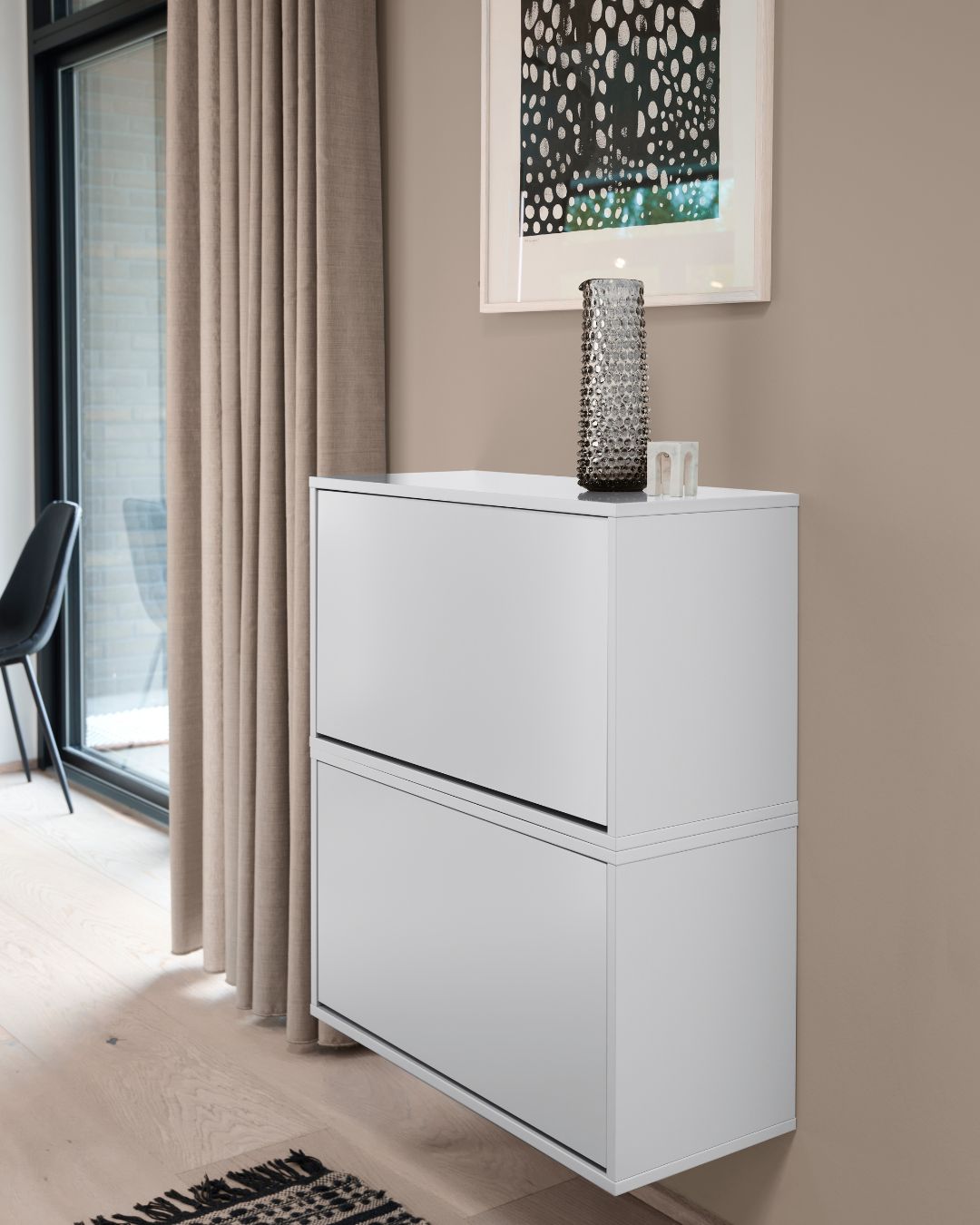 ReCollector Shoe Box — modular, wall-mounted storage crafted in Denmark from FSC-certified wood. Available in five colours plus oak veneer, each unit stores 6–8 pairs (W70 × H40 × D30 cm). The classic, stackable design saves floor space and integrates with matching ReCollector modules to create a personalised storage wall. Front access via a secure push-lock; top surface usable for display. Delivered flat-packed to minimise transport CO2 and protected against damage; assembly is straightforward with the included guide. Designed to last; clean with a soft damp cloth and mild soap as needed.