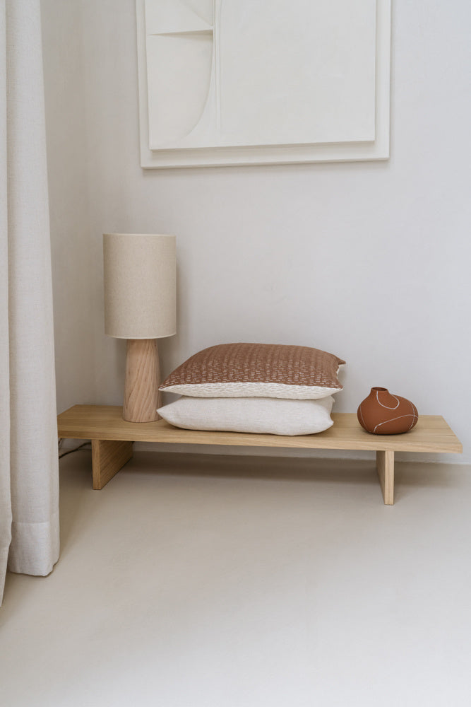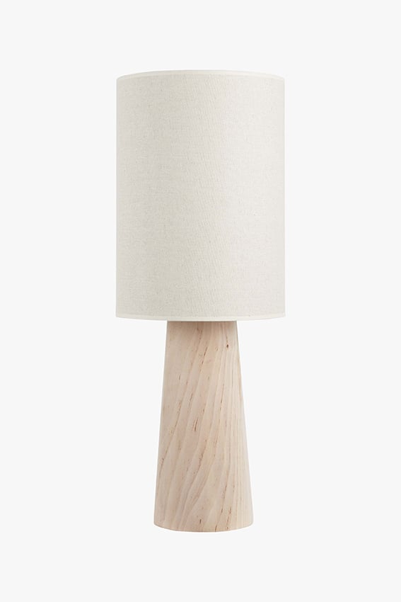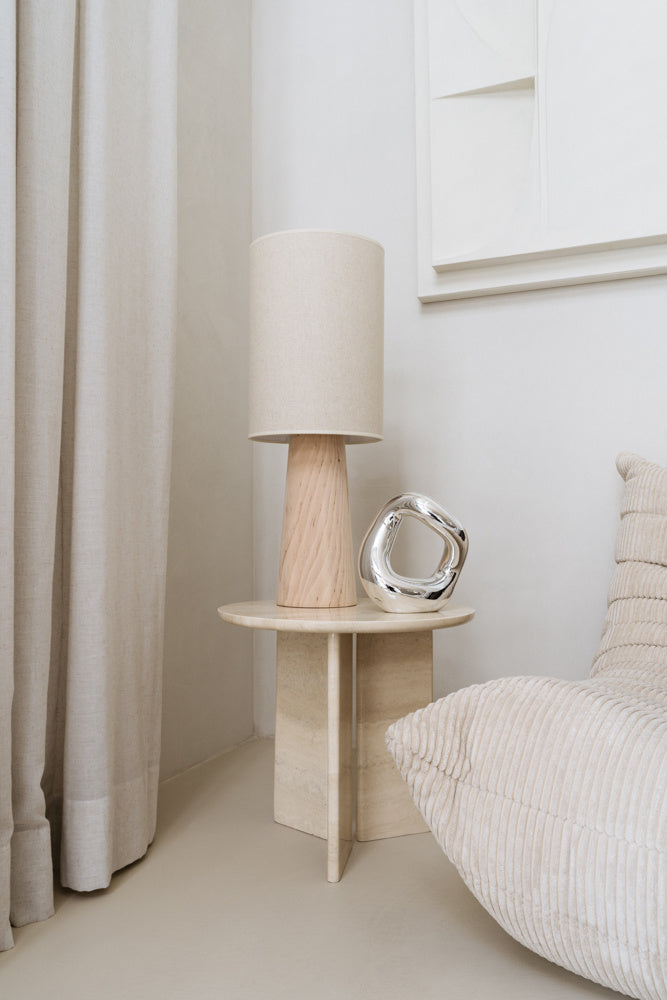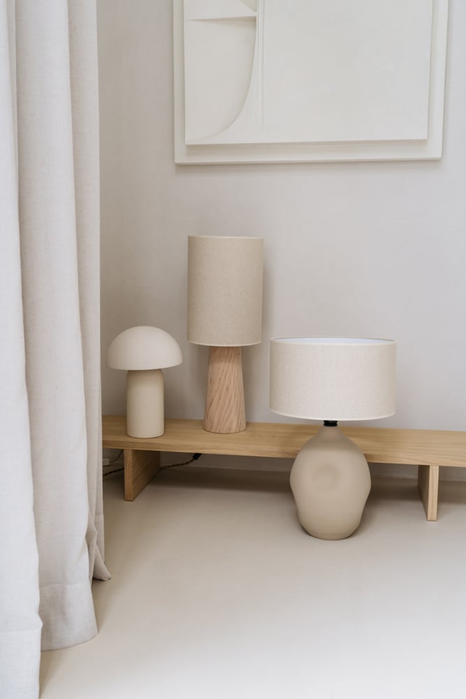 The table lamp Fay is described by us as 'natural elegance'. The lamp is crafted in Spain with natural materials. The base of the lamp is made of birch wood, known for its light color and subtle grain pattern. It features a natural linen shade with piping that not only looks beautiful but also provides a soft and warm light diffusion. The combination of birch wood and linen gives the table lamp a timeless appeal that will remain beautiful for years. Fay stands at a total height of 65 cm, with a shade diameter of 25 cm and height of 35 cm. The base is 40 cm tall, 14 cm wide at the bottom, and 10 cm wide at the top. This base includes a linen cord with plug.