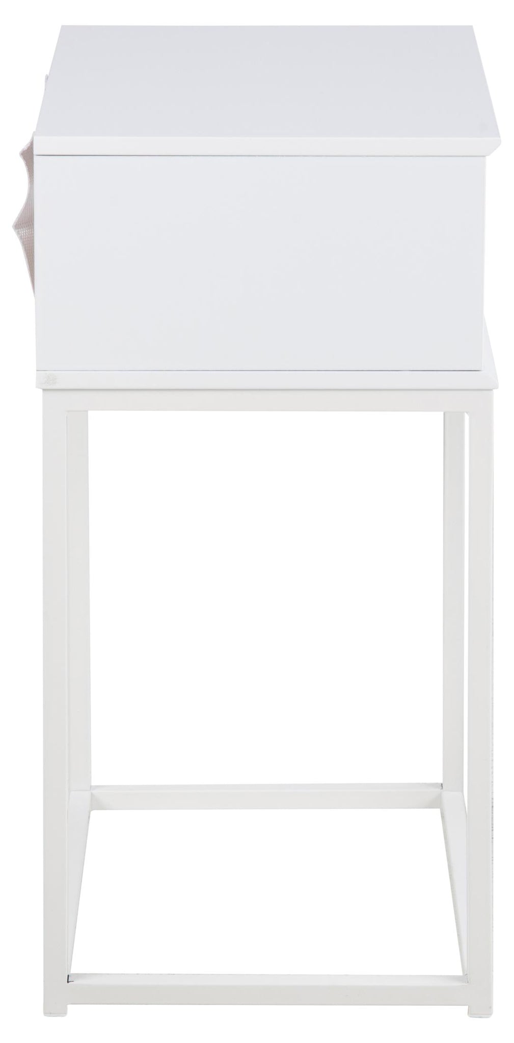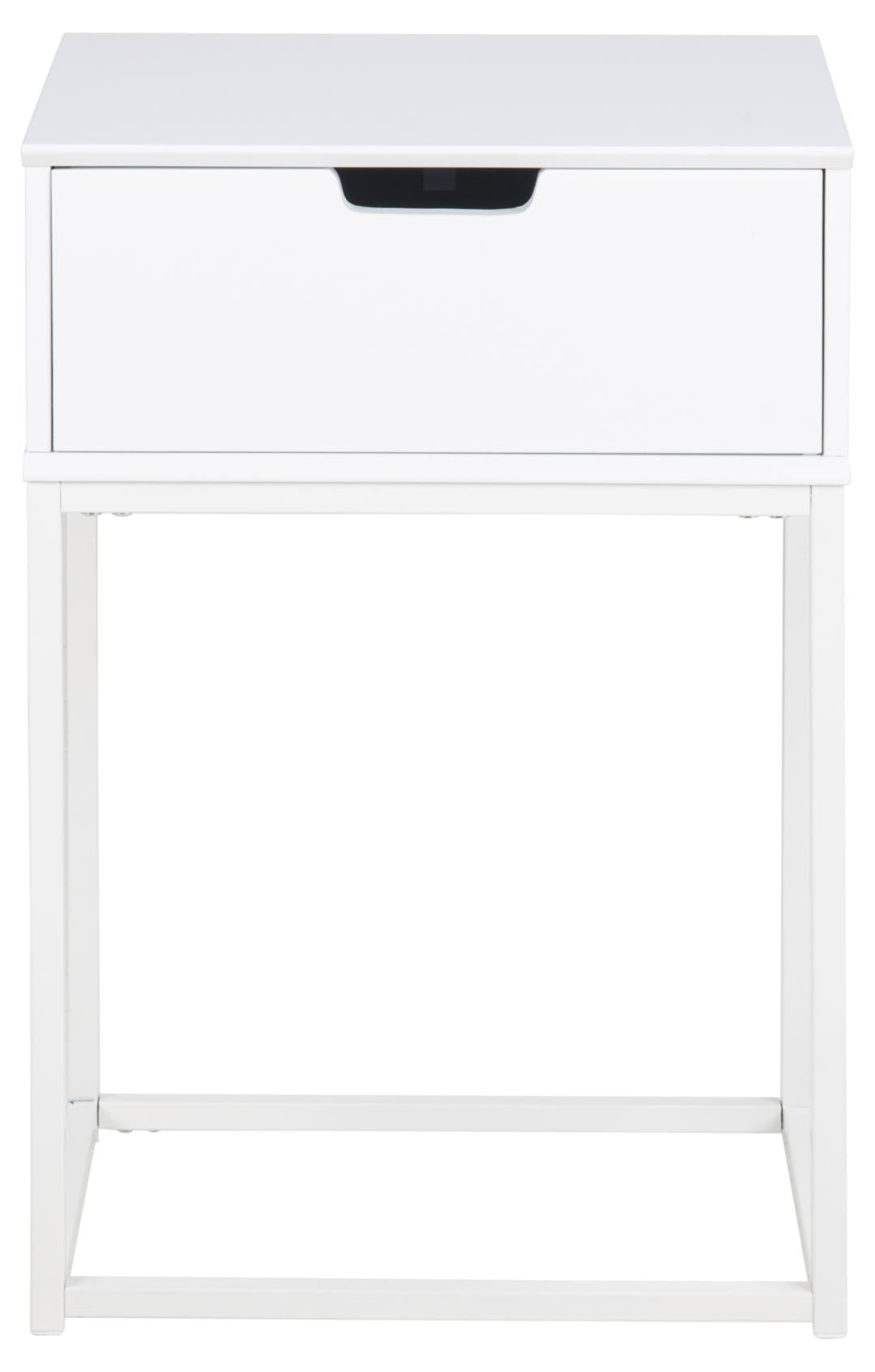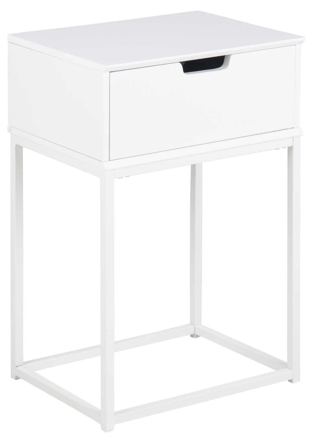 Enhance your bedroom with this sophisticated white bedside table. The wooden drawer provides convenient storage for your essentials. Its sleek design includes a powder-coated metal base and an integrated handle for a touch of elegance. Easy to assemble with a knock-down design, this table is crafted from MDF and steel materials. It features one drawer with inner measurements of W:37.5 D:29 H:12.5 and a maximum weight capacity of 5. The table's dimensions are H:61.5 W:40 D:30 and weighs 6.3kg. Add style and functionality to your space with this elegant piece.