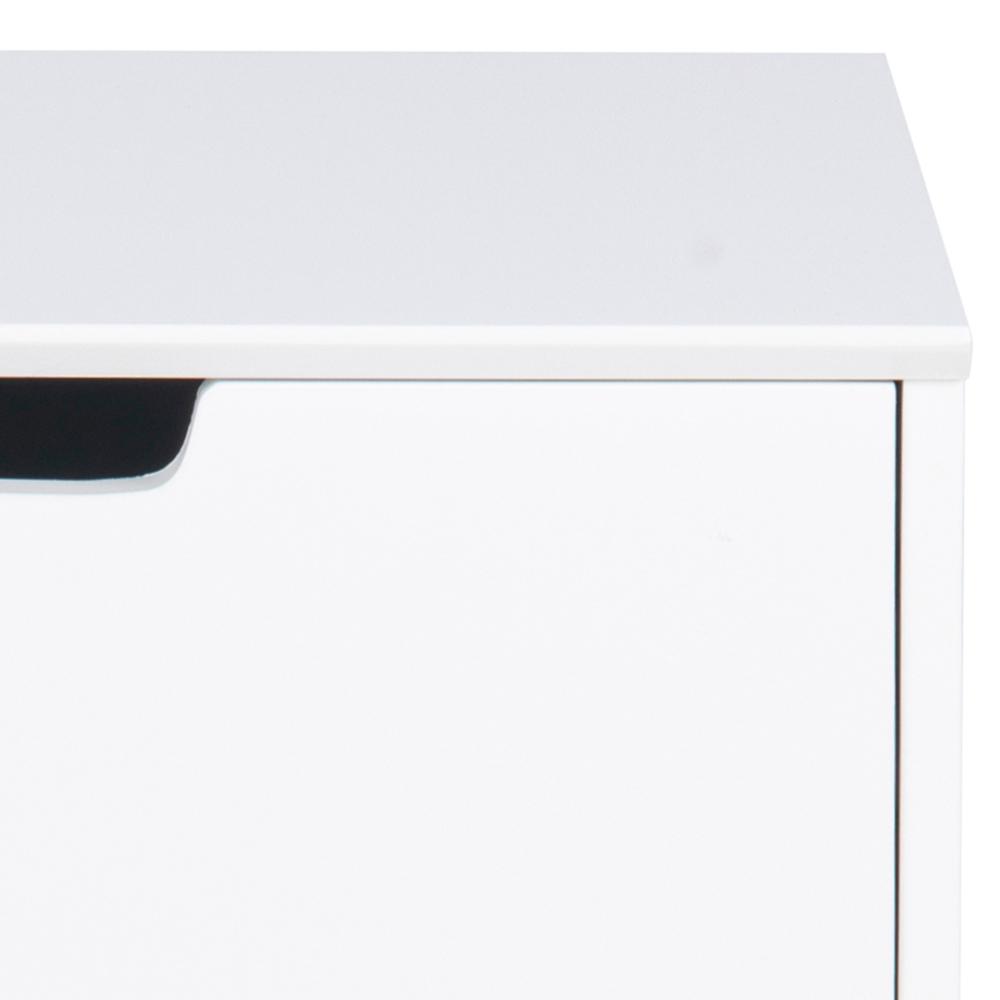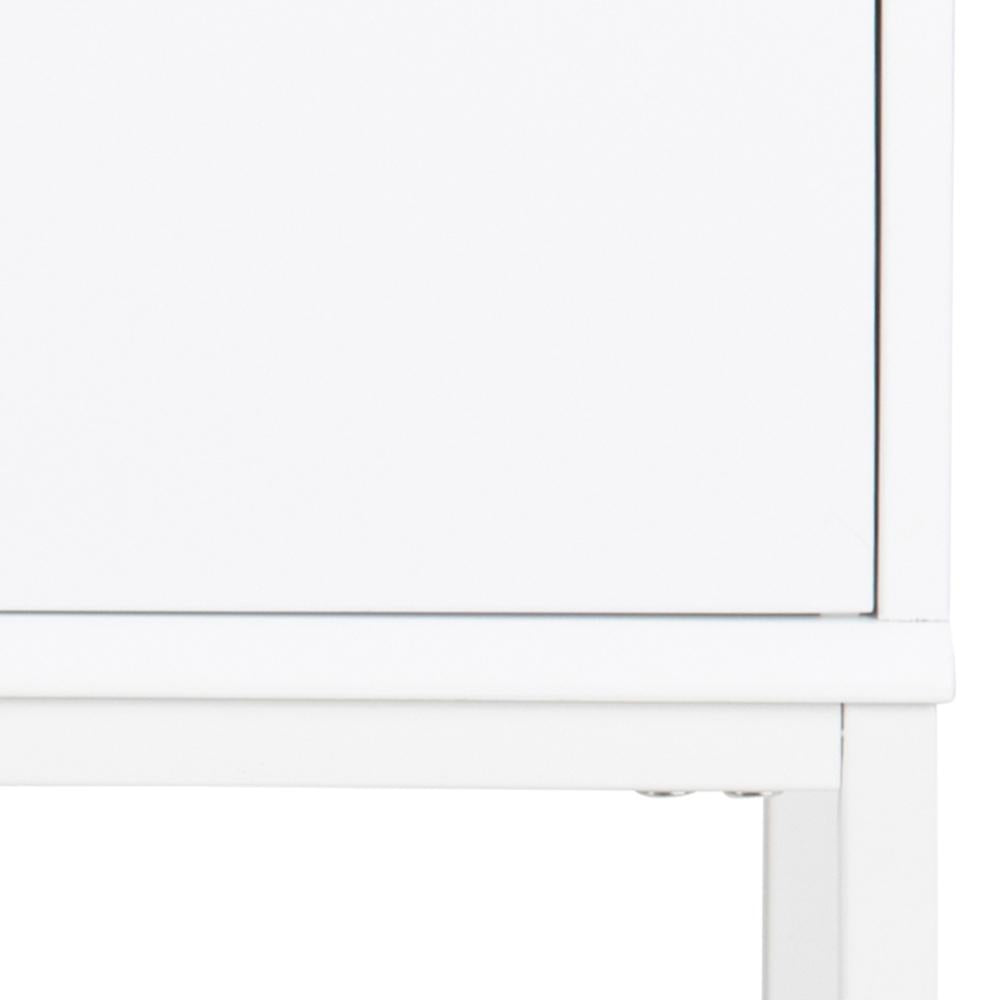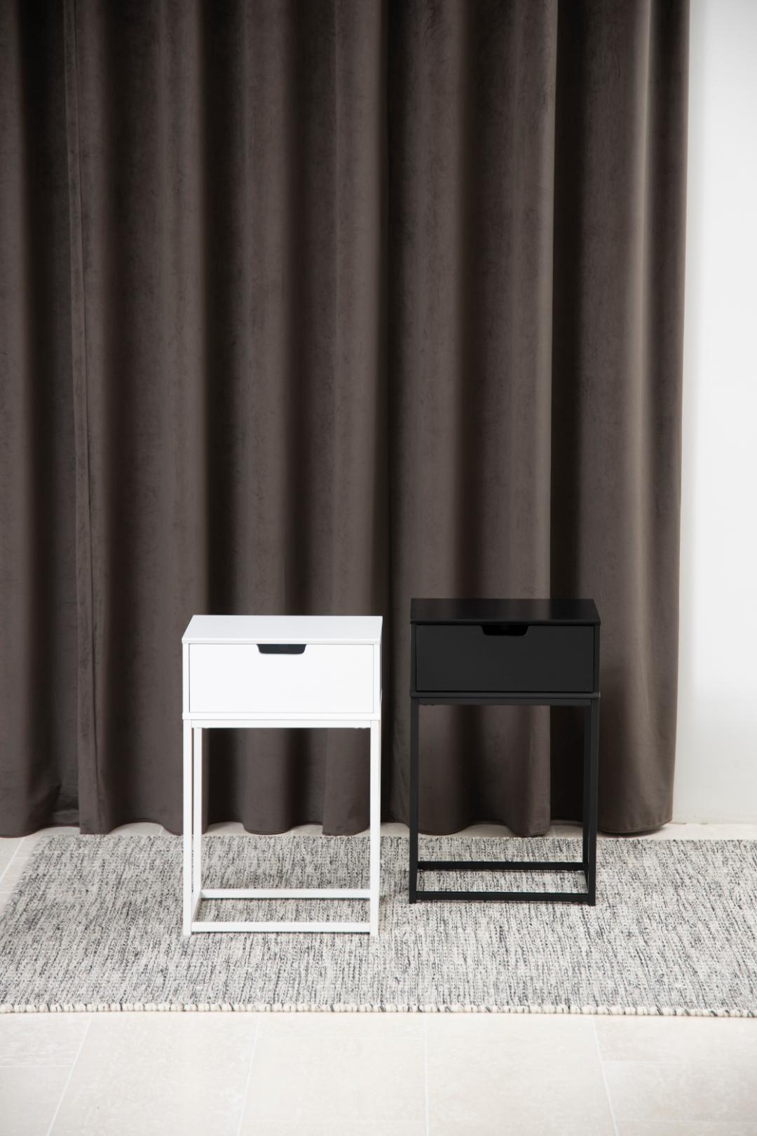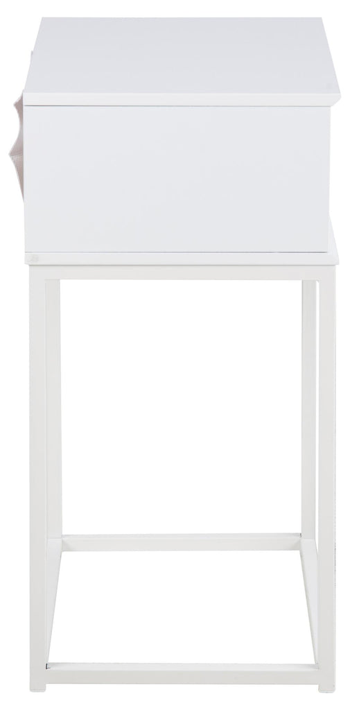 Enhance your bedroom with this sophisticated white bedside table. The wooden drawer provides convenient storage for your essentials. Its sleek design includes a powder-coated metal base and an integrated handle for a touch of elegance. Easy to assemble with a knock-down design, this table is crafted from MDF and steel materials. It features one drawer with inner measurements of W:37.5 D:29 H:12.5 and a maximum weight capacity of 5. The table's dimensions are H:61.5 W:40 D:30 and weighs 6.3kg. Add style and functionality to your space with this elegant piece.