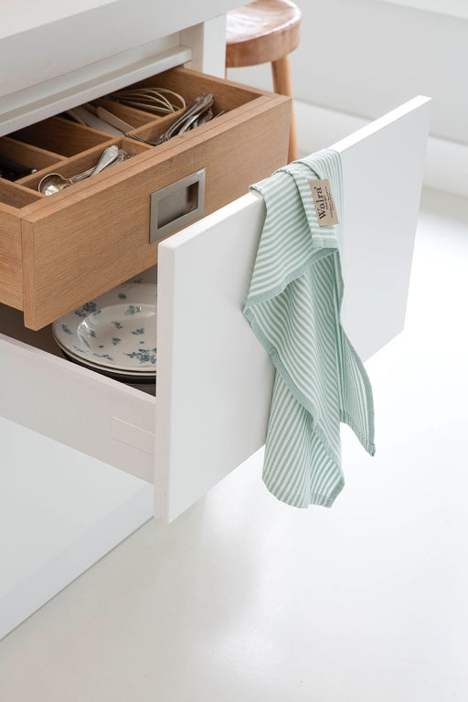 The superior kitchen and tea towel set by Walra includes two tea towels: the Superior Dry cloth with a striped motif, and the Superior Glass cloth with a diamond motif. Additionally, the set contains one kitchen towel: the Superior Kitchen cloth, ideal for drying hands. These high-quality towels are highly absorbent and feature a convenient loop. The classic and timeless designs effortlessly complement any interior. Washable at 60°C and dryable at low temperature in a dryer.