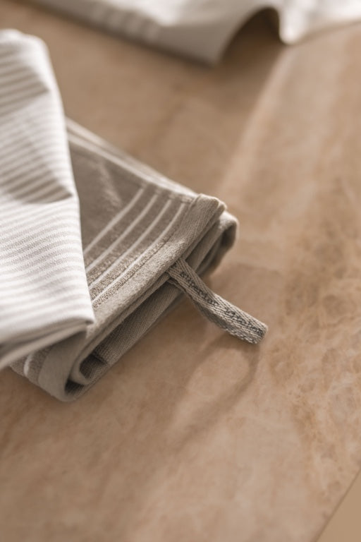 The superior kitchen and tea towel set by Walra includes two tea towels: the Superior Dry cloth with a striped motif, and the Superior Glass cloth with a diamond motif. Additionally, the set contains one kitchen towel: the Superior Kitchen cloth, ideal for drying hands. These high-quality towels are highly absorbent and feature a convenient loop. The classic and timeless designs effortlessly complement any interior. Washable at 60°C and dryable at low temperature in a dryer.